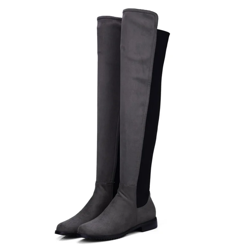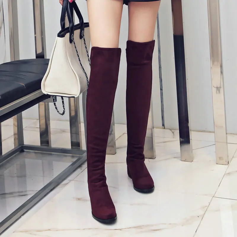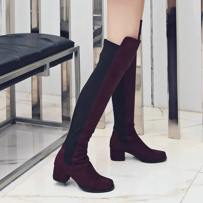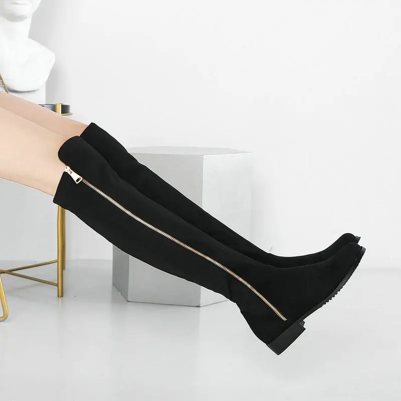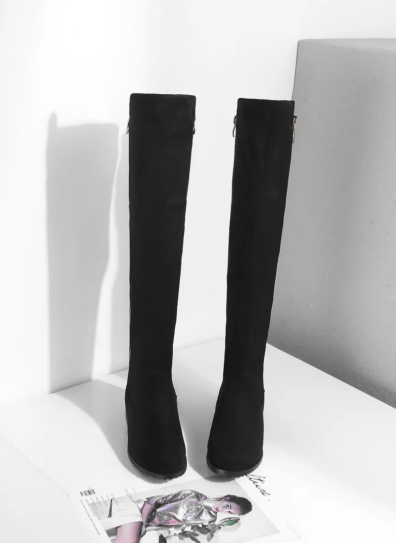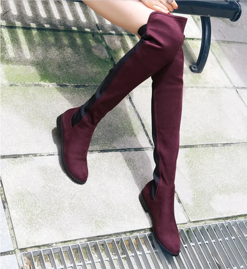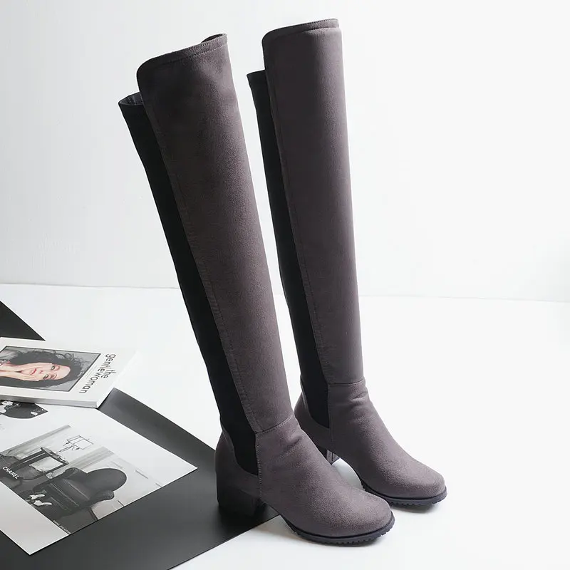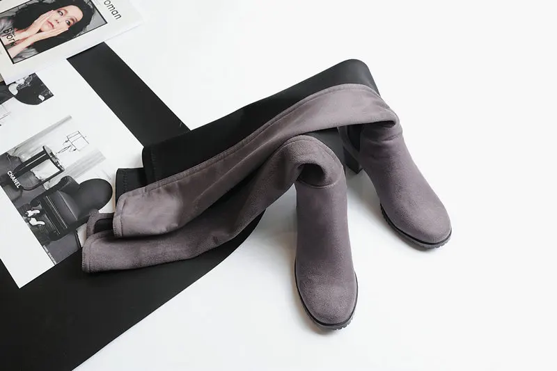 Сапоги выше колена на низком каблуке; Женские модные эластичные сапоги из искусственного флока