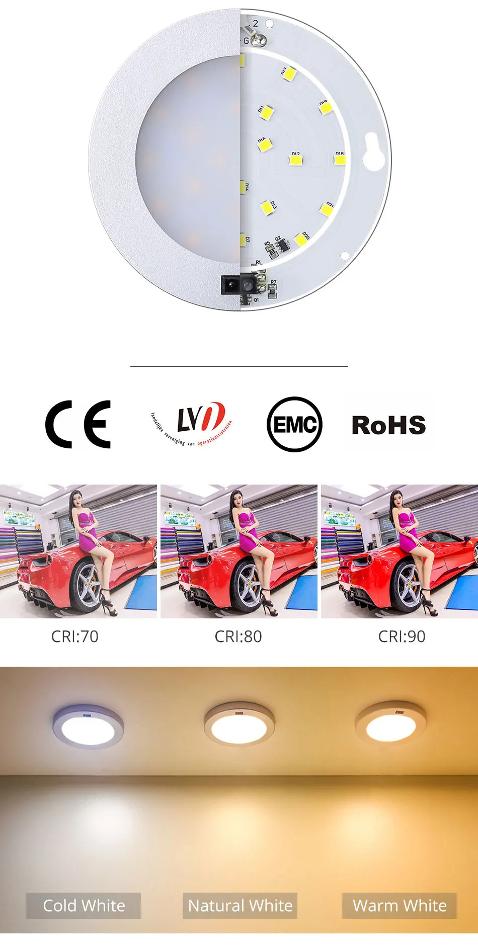 Цвет: теплый белый (2800- 3200K); Натуральный белый (4000-4500K); Холодный белый (5500-6500K)