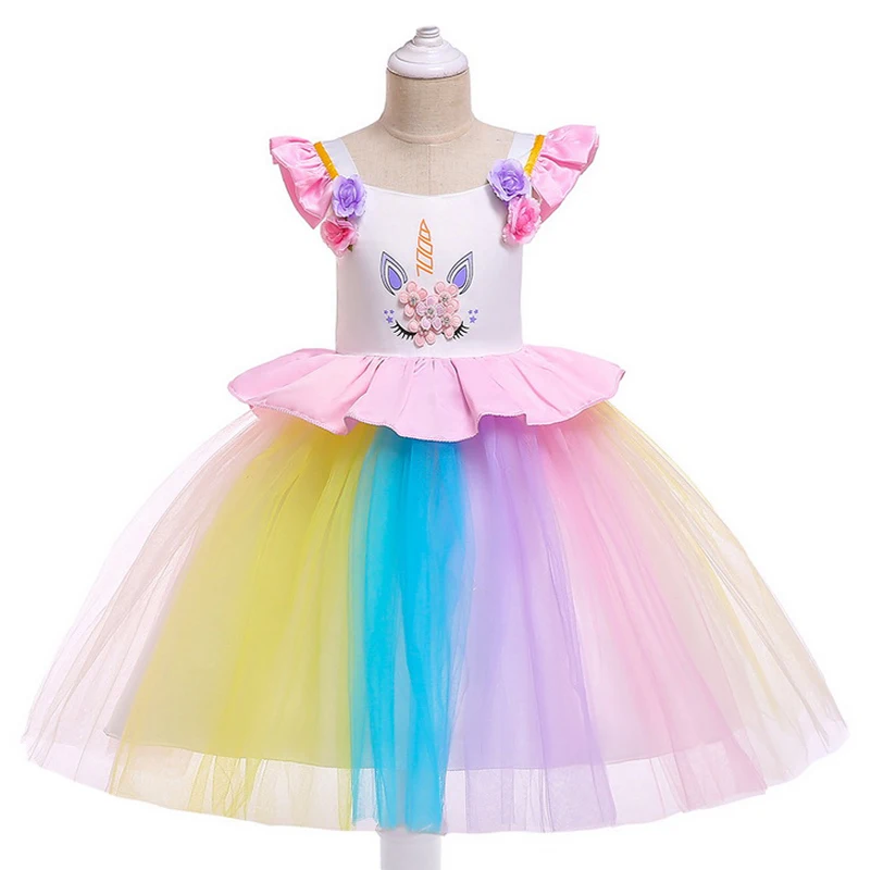 Необычные детские платья-пачки с радужными цветами и единорогом; Платья принцессы с рукавами-крылышками для девочек; Вечерние костюмы на день рождения