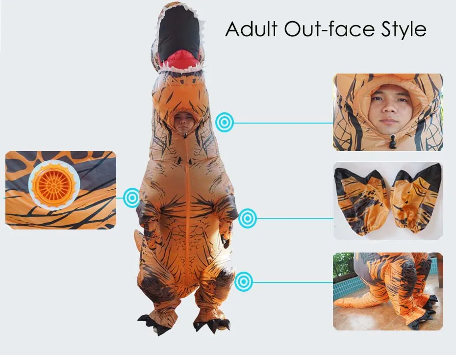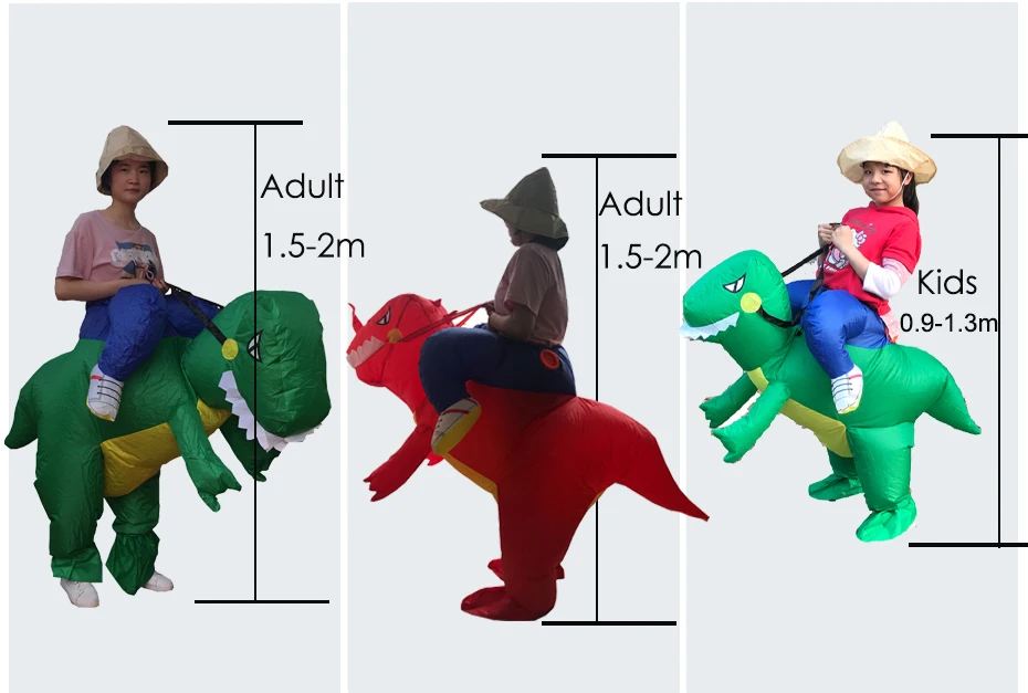 Для взрослых T-Rex 2,2 м, костюм 1,5-2 м для взрослых; Дети T-Rex в парк развлечений 1,8 м, костюм 0,9-1,3 м; Подходит для детей от взрослых в натуральную величину Велоцираптор 2,3 м, костюм 1,5-2 м для взрослых; Двойные вентиляторы для взрослых T-Rex включают в себя 1 костюм, 2 перчатки, 2 вентилятора, 2 батарейных отсека, 2 usb-кабеля, 1 сумку; Для взрослых, один вентилятор T-Rex включает 1 костюм, 2 перчатки, 1 вентилятор, 1 батарейный блок, 1 usb-кабель, 1 сумка; Дети T-Rex включают 1 костюм, 2 перчатки, 1 вентилятор, 1 батарейный блок, 1 USB кабель, 1 сумка; Велоцираптор для взрослых включает 1 костюм, 2 перчатки, 2 вентилятора, 2 батарейных отсека, 2 usb-кабеля, 1 сумку; Взрослый зеленый и красный динозавр включает в себя 1 костюм, 1 шляпу, 1 вентилятор, 1 батарейный блок, 1 usb-кабель, 1 сумку; Детский Зеленый Динозавр включает 1 костюм, 1 шляпу, 1 вентилятор, 1 батарейный блок, 1 usb-кабель, 1 сумку