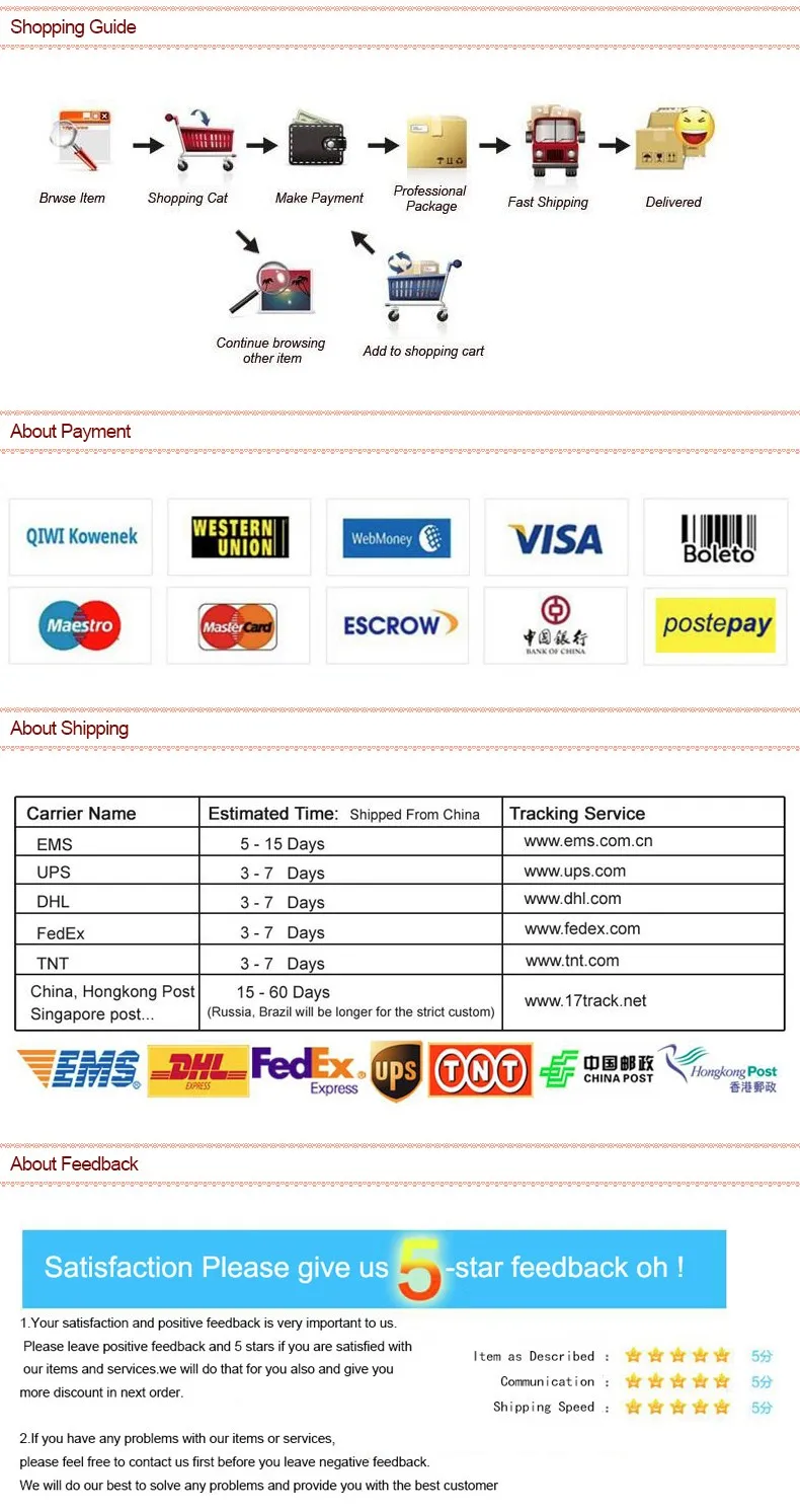 2. Посылка ка занимает 20-60 дней, чтобы добраться до вас, иногда это занимает больше дней. Если вам нужно полное отслеживание, пожалуйста, выберите "Почта Китая Registered Air Mail", и добавьте дополнительные деньги для отслеживания.