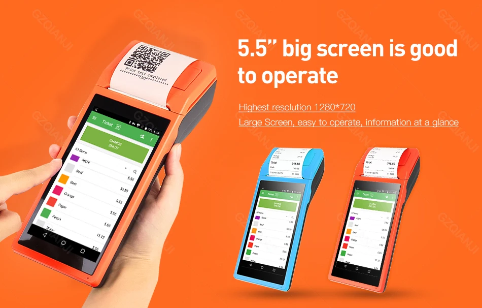 2. Компактный размер и беспроводной дизайн, легко носить с собой и удобно использовать; Встроенный аккумулятор емкостью 5000 мАч поддерживает длительное время работы. 3. Встроенный pos чековый принтер использует 58*35 мм печатная бумага, Нет необходимости печати картриджей или лент для низкой стоимости эксплуатации, низкий уровень шума и высокая скорость во время печати. 4. Этот принтер PDA поставляется сОС Android 6,0, Плавная и стабильная работа, отлично подходит для приложений на базе Android, которые нуждаются в функции печати или сканирования 1D. 5. Удобный для пользователя-умный pos-терминал очень эффективно обрабатывает продажи и подходит для управления складами и малого бизнеса, таких как кафетерий, бутик, книжный магазин и т. д. Спецификация:1. Модель: GZPDA03 2. Цвет: Синий/оранжевый (опционально) 3. Конфигурация: 3G связь + камера. 4. Процессор: Quad-Core 1,3 ГГц MT6580V/WA 5.ОЗУ: 1 Гб 6. NAND Flash: 4 Гб 7. Операционная система: Android 6,0 8. Основной экран: 5,5 дюймов, 1280*720 IPS экран емкостный сенсорный экран 9. Способ связи: 3G (подходит для всех видов сетей) 10. Задняя камера: 800 Вт вниз совместима 11. Аккумулятор: 7,4 В, 5000 мАч 12. Зарядка Интерфейс: постоянный ток заряда, 12V 1.5A 13. Наушники Интерфейс: 3,5 мм Стандартный наушники 14. OTG: Поддержка 15. Интерфейс USB: Micro USB2.0 * 1 16. Аудиосистема: встроенный динамик, зуммер, микрофон 17. WiFi: 802.11b/g/n 18. GSM: GSM850/900/1800/1900 19. WCDMA: B1 20. BT: Bluetooth 4,0 21. Печать: Therminal Pinter, бумага прокрутки 58*35 (не входит в комплект) 22. Принтер Размеры: 21,5*8,6*5,3 см/8,46*3,39 * 2.1in 23. Вес принтера: 462 г/16,3 унций 24. Посылка Размеры: 24,5*13,3*9 см/9,65*5,24 * 3.54in 25. Вес посылка: 850 г/29,98 унций Упаковочный лист: 1 * принтер PDA 1 * Адаптер зарядного устройства (Штепсельная вилка ЕС или штепсельная вилка США) 1 * Руководство пользователя (английский и китайский)