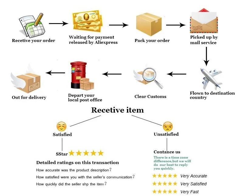 Оптовая и Прямая поставка приветствуются? В случае оптовой закупки мы предлагаем скидку или бесплатную экспресс-доставку. Ее срок составляет всего 3–7 дней. По запросу мы можем посылать товары напрямую вашим клиентам, не предоставляя информацию о себе (дропшиппинг). Как отследить мою посылку? Вы можете отслеживать свою посылку на следующем веб-сайте, используя ваш номер отслеживания:/global.cainiao.com/или Www.17track.net/en (скопировано в браузер, чтобы открыть) Что я могу сделать, когда время защиты покупки заканчивается? Если срок защиты заказа истекает, свяжитесь с нами, и мы поможем его продлить. Так что ваши деньги не пойдут на мой счет. Заказ и доставка 1. Пожалуйста, завершите оплату в течение 7 дней после размещения заказа, или заказ будет отменен системой автоматически. Пожалуйста, убедитесь, что адрес доставки и контактная информация верны и полны. 2. Обычно мы бесплатно доставляем вам товары почтой Китая Air mail пожалуйста, сперва свяжитесь с нами, если вы хотите осуществить доставку через DHL, UPS, EMS, Fedex или другие службы доставки. Оценка и обслуживание 1. Если вы удовлетворены, пожалуйста, сделайте нам услугу, чтобы оставить 5 звезд положительные отзывы после получения товара. 2. Мы стремимся к вашему удовлетворению. Пожалуйста, не стесняйтесь связаться с нами через AliExpress сообщение, если есть какие-либо вопросы.
