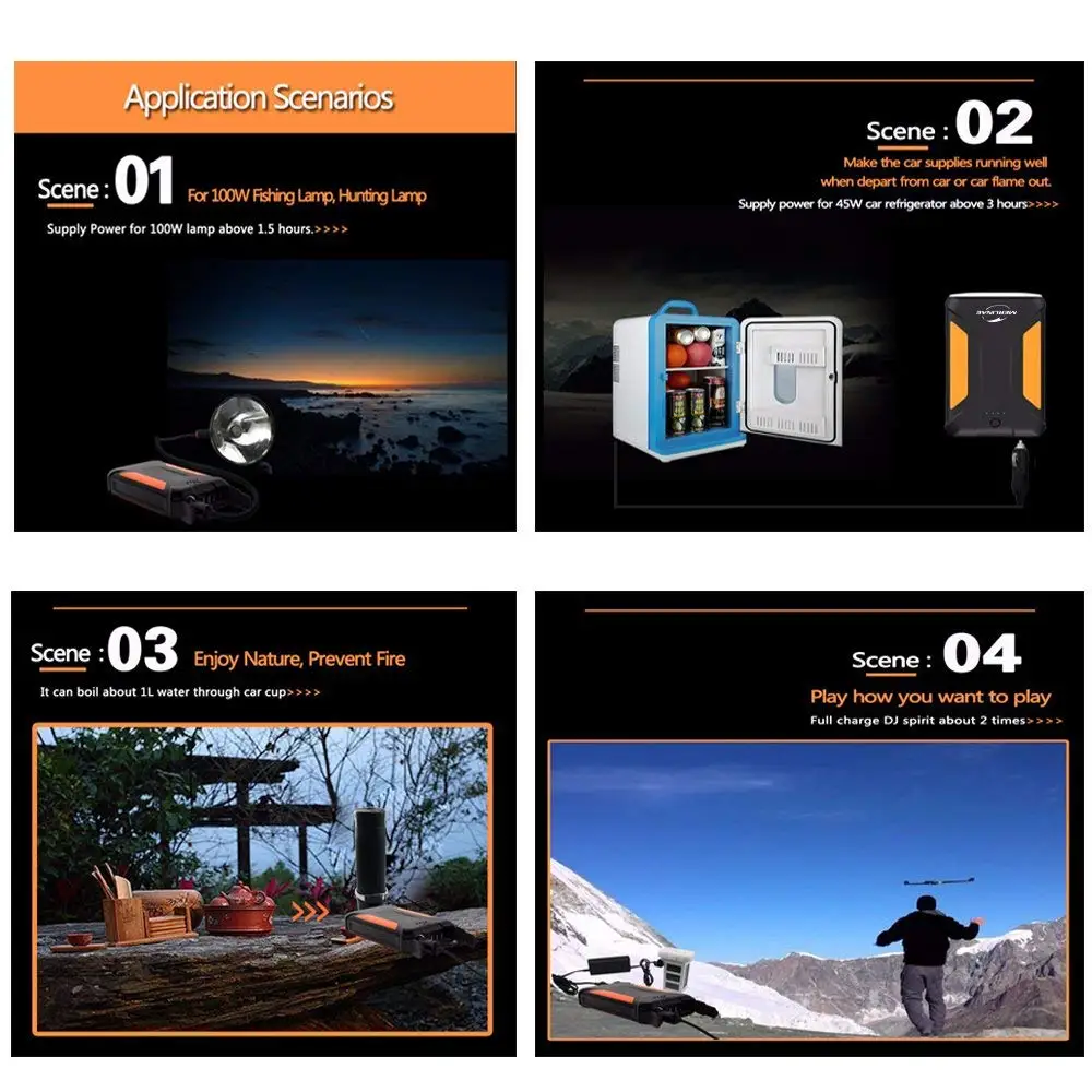 Этот внешний аккумулятор может применяться ко многим видам оборудования для активного отдыха, таким как освещение, батарея БПЛА, Интер телефон), автомобильная техника (автомобильный холодильник, насос для накачки) Время работы батареи и аварийный источник питания при аварийной ситуации. Это может быть идеальным источником питания для активного отдыха, например, кемпинга, пеших прогулок, дня рождения и путешествий!