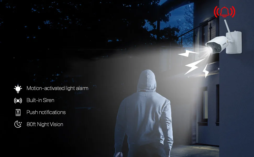 Эта камера никогда не засыпает и готова к реагированию на любую потенциальную опасность благодаря мощному прожектору и мощной сирены, срабатывающей при движении человека,-также преследовать темноту и неприятности.