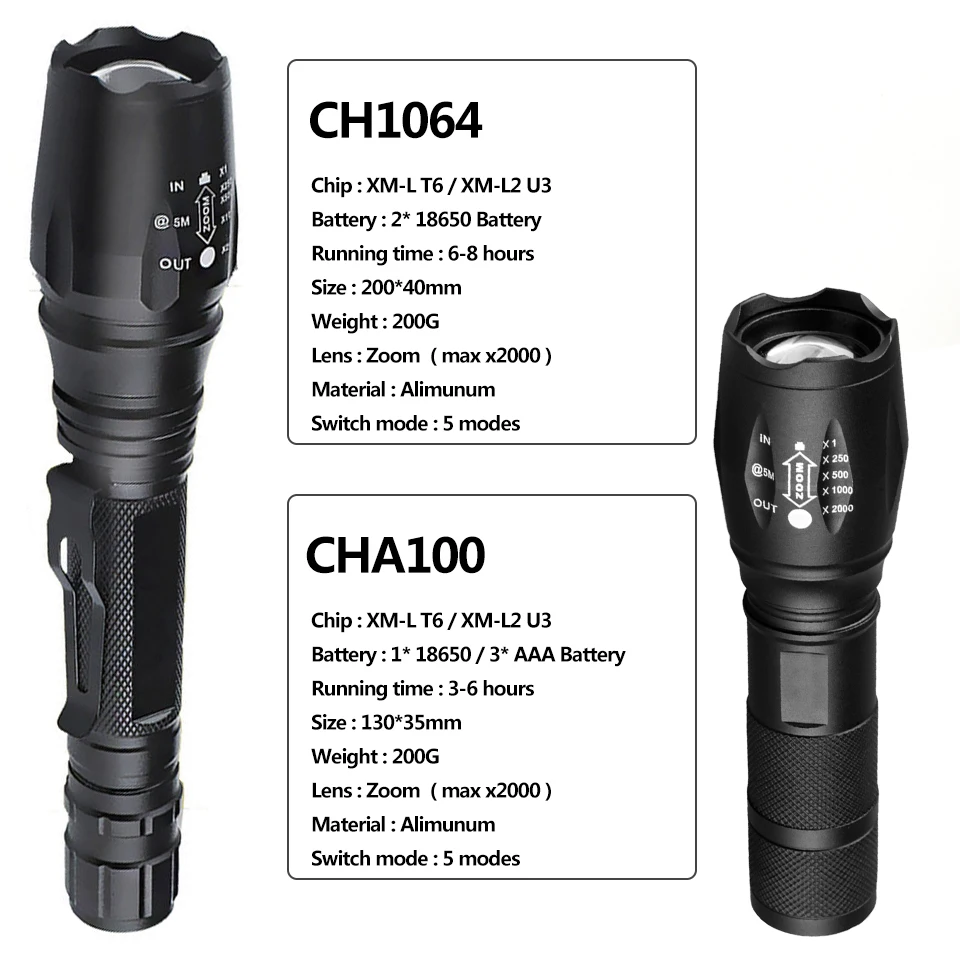 1. Корпус этого фонарика изготовлен из высококачественного алюминиевого сплава, и он имеет очень прочную конструкцию2. Внутренняя проводка применяется Высокоэффективная схема усилителя, и может использовать батареи в наибольшей степени3. Отличная водонепроницаемость, подходит для наружной среды, неблагоприятных погодных условий, кроме использования4. Функция фокусировки, позволяющая фокусировать луч.Технические характеристики:1. Модель: 10642. Тип Излучателя: XM-L L2 U3 / T6 (опционально)4. Количество ламп: 15. Цвет света: белый6. Срок службы светодиодов: 100000 часов7. Режимы: 58. Расположение режимов: увеличение и уменьшение9. Максимальное расстояние освещения: 500 м10. Конфигурация аккумулятора: T6: аккумулятор 2*1865011. Входное напряжение: 3,7-4,2 в13. Тип переключателя: Clicky/Clickie14. Расположение переключателя: задний колпачок15. Линза: выпуклая линза16. Особые функции: возможность увеличения17. Материал: алюминиевый сплав18. Цвет: черныйСоветы: