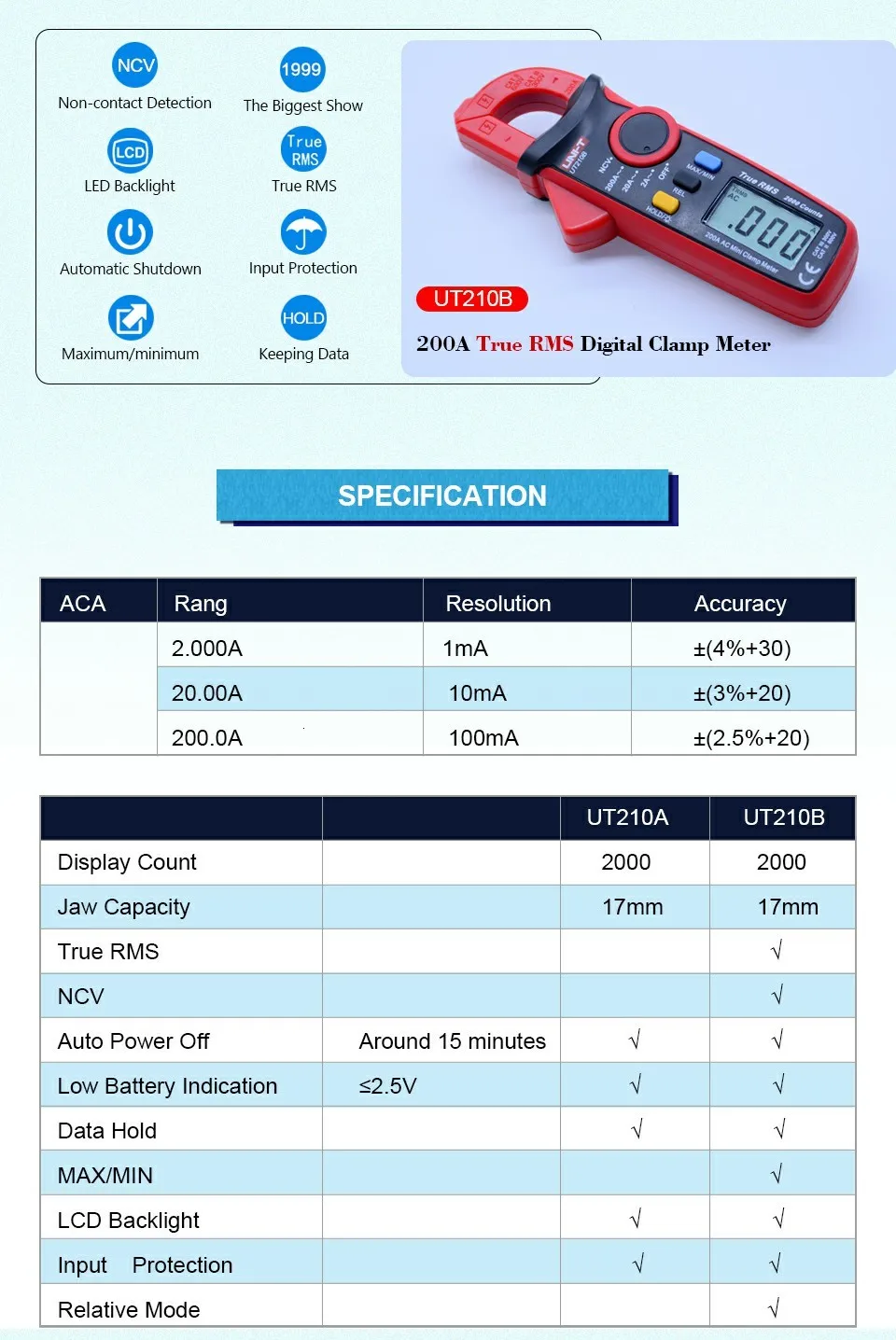 UNI-T UT210BМини-клещи-это 200A настоящий RMS цифровой клещи с 2000 счетом дисплея. Это легкое, портативное и эргономичное устройство.