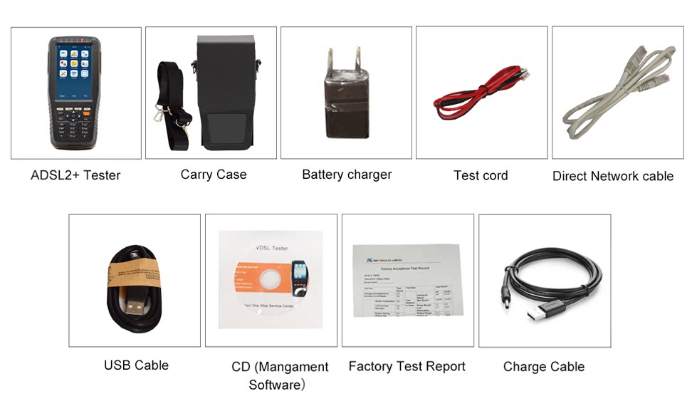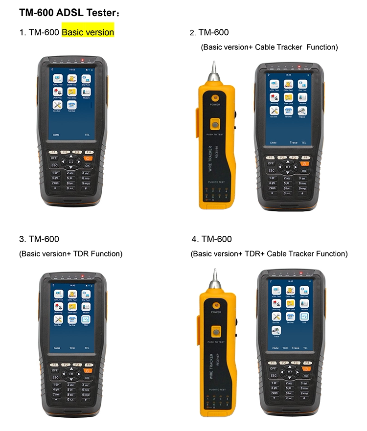 TM-600 ADSL2 + тестер специально разработан для линия xDSL тест (xDSL включает: ADSL, ADSL2, ADSL2 +, READSL и т. Д.) и обслуживание он обеспечивает xDSL тест, PPPoE циферблат тест, DMM тест, модем эмуляции, индикация напряжения и так далее.