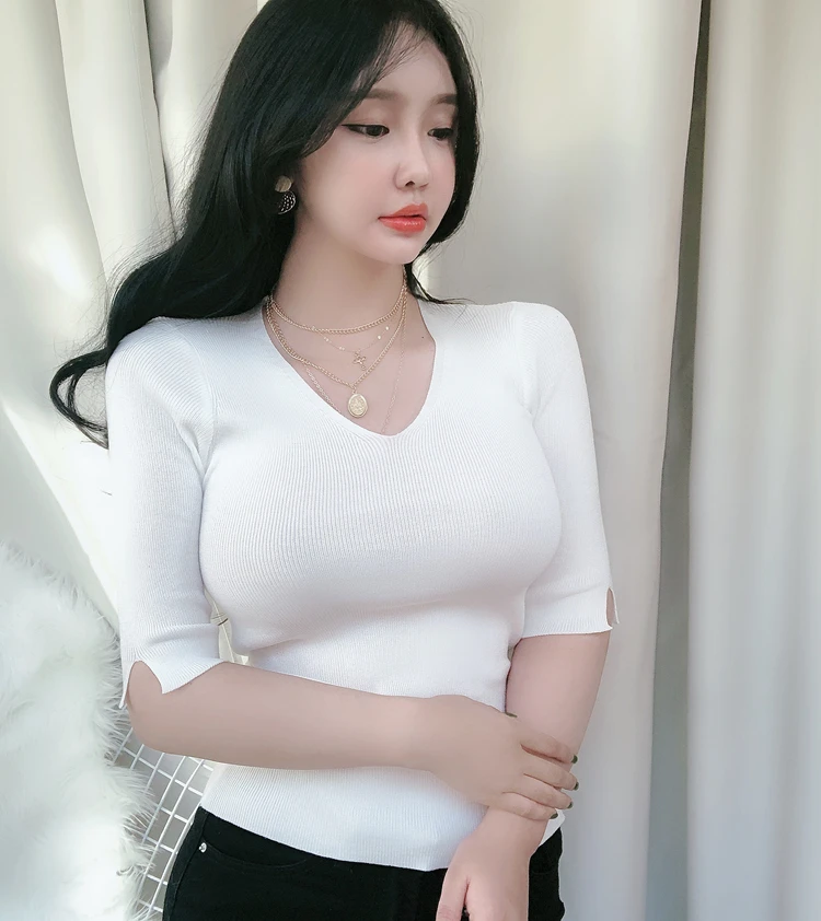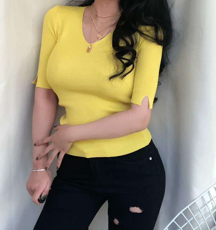 Женский трикотажный джемпер с V образным вырезом и полурукавом| |