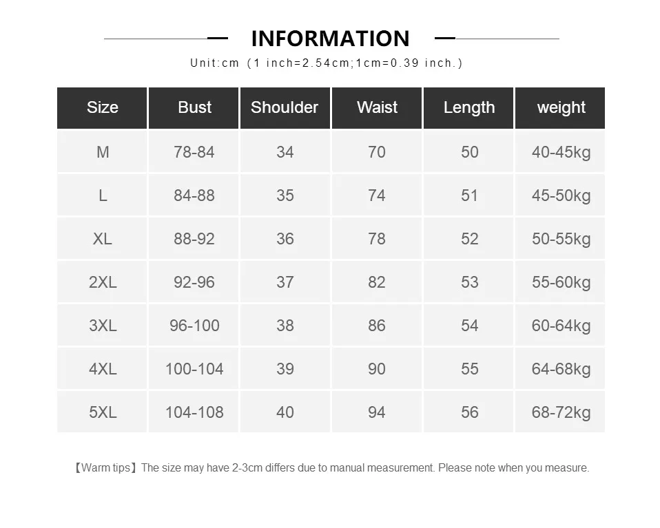 M: обхват груди 78-84 см, ширина плеч 34 см, обхват талии 68-70 см, длина 50 см, вес тела 40-45 кг. L: обхват груди 84-88 см, ширина плеч 35 см, обхват талии 72-74 см, длина 51 см, вес тела 45-50 кг. XL: обхват груди 88-92 см, ширина плеч 36 см, обхват талии 76-78 см, длина 52 см, вес тела 50-55 кг. 2XL: обхват груди 92-96 см, ширина плеч 37 см, обхват талии 80-82 см, длина 53 см, вес тела 55-60 кг. 3XL: обхват груди 96-100 см, ширина плеч 38 см, обхват талии 84-86 см, длина 54 см, вес тела 60-65 кг. 4XL: обхват груди 100-104 см, ширина плеч 39 см, обхват талии 88-90 см, длина 55 см, вес тела 64-68 кг. 5XL: обхват груди 104-108 см, ширина плеч 40 см, обхват талии 92-94 см, длина 56 см, вес тела 68-72 кг. О размере: 1: замеры сделаны вручную, поэтому возможны отклонения на 2-3 см (1 дюйм = 2,54 см; 1 см = 0,39 дюйма). 2: пожалуйста, внимательно проверьте таблицу размеров перед покупкой товара. Если вы не знаете, как выбрать размер, пожалуйста, свяжитесь с нашей службой поддержки клиентов. 3: выберите больший размер, если ваш размер между двумя размерами. О цвете: Как известно, цвета на мониторе вашего компьютера могут немного отличаться от реальных цветов товара в зависимости от настроек вашего монитора. Спасибо!