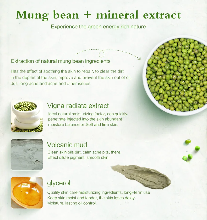 Содержит экстракт зеленых бобов, его текстура мягкая и деликатная, которая легко впитывается. Она может пополнять богатую влагу и питание, чтобы облегчить сухость и шероховатость кожи и очистить грязь В коже поры и косметические остатки. Означает, что, хотя это также может улучшить тусклую кожу, укрепить поры кожи и сохранить контроль масла для удаления акне, оставляя вашу кожу влажной и гладкой с пухлым Яркость