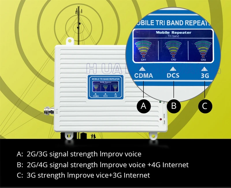 1. Рабочая система: CDMA 850 + DCS 1800 + WCDMA 2100 три диапазона. 2. (полоса 5) CDMA 850 МГц. Частота подключения: 824-849 МГц. Частота нисходящего канала 869-894 МГц. 3. (полоса 3) DCS / LTE 1800 МГц. Частота подключения: 1710-1785 МГц. Частота нисходящего канала 1805-1880 МГц. 4. (полоса 1) WCDMA 2100 МГц. Частота подключения: 1920-80 МГц. Частота нисходящего канала 2110-2170 МГц. 5. Поддержка голоса и 2g 3g 4g интернет. 【Лучший голос и дата 】получайте меньше сброшенных звонков, лучшее качество голоса, более быстрая загрузка и загрузка. Вы можете поделиться с вами приятным временем с помощью хорошего голосового звонка, и вы не беспокоитесь о том, что звонок неожиданно отпадет. 6. Высокий коэффициент усиления: 70 дБ. Покрытие: 400 квадратных метров 7. ЖК-дисплей: Да. 8. Подходит для: Новой Зеландии, Австралии, Израиля и т. Д.
