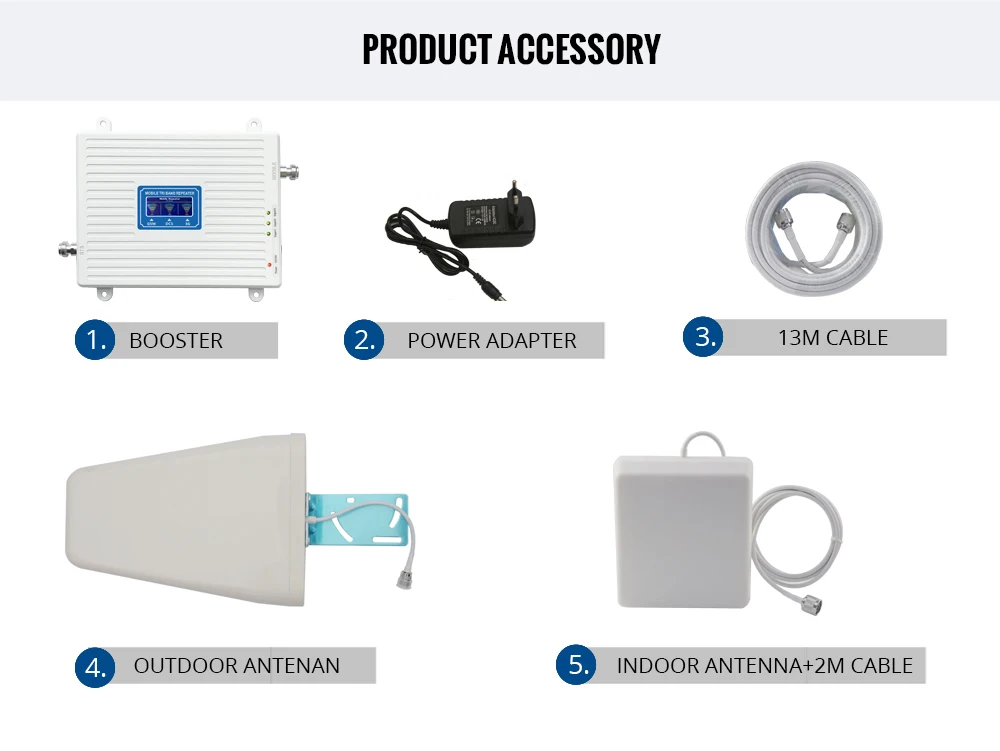 1. 850 + 1800 + 2100 трехдиапазонный ретранслятор сигнала 2. Наружная антенна 3. Внутренняя антенна 4. Кабель 13 метров 5. Разъем питания.