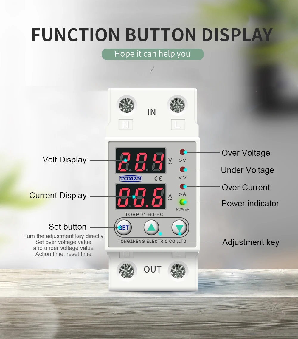 Функции:1. Защита от перенапряжения2. Защита от напряжения3. Предохранение от перетока4. Автоматическое восстановление5. Дисплей напряжения (измерение напряжения)6. Текущий Дисплей (Измерение тока)7. Калибровка напряжения A13Параметры продукта:1. Номер модели: TOVPD1-60-EC2. Питание: 230VAC 50/60 Гц3. Макс. мощность загрузки: 1 ~ 40A Регулируемая (по умолчанию: 40A)1 ~ 63A Регулируемый (по умолчанию: 63A)4. Диапазон значений защиты от перенапряжения: 230 В ~ 300 В (по умолчанию: 270 В) Диапазон напряжения восстановления перенапряжения: 225V--295V (по умолчанию: 250 В)Время действия защиты от сверх напряжения: 0,1 s ~ 30s (значение по умолчанию: 0.5s) Напряжение r Время задержки ecovery: 1s ~ 500s (по умолчанию: 30s)5. Диапазон значений защиты под напряжением: 140V--210V (по умолчанию: 170 В) Диапазон напряжения восстановления под напряжением: 145V--215V (по умолчанию: 190 В)Время действия защиты от напряжения: 0,1 s ~ 30s (по умолчанию: 0.5s)Под напряжением R Время задержки ecovery: 1s ~ 500s (по умолчанию: 30s)6. Диапазон регулировки по току: 1-40A (по умолчанию: 20A) 1-63А (По умолчанию: 40A)Диапазон действия сверх тока: 0,1 ~ 30 секунд (по умолчанию: 0.5s) Сверх тока R Время задержки ecovery: 1s ~ 500s (по умолчанию: 30s)7.Power-on Время задержки: 1s ~ 500s (по умолчанию: 10s)9. Потребляемая мощность: <2 Вт10. Жизнь электрических машин: 100 000 раз11. Установка: 35 мм DIN rail ![]()