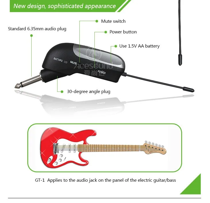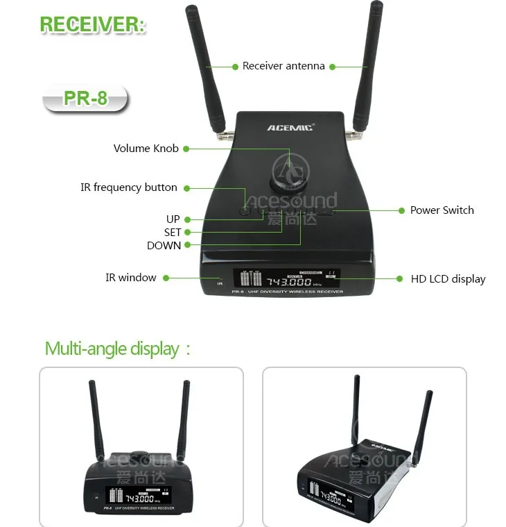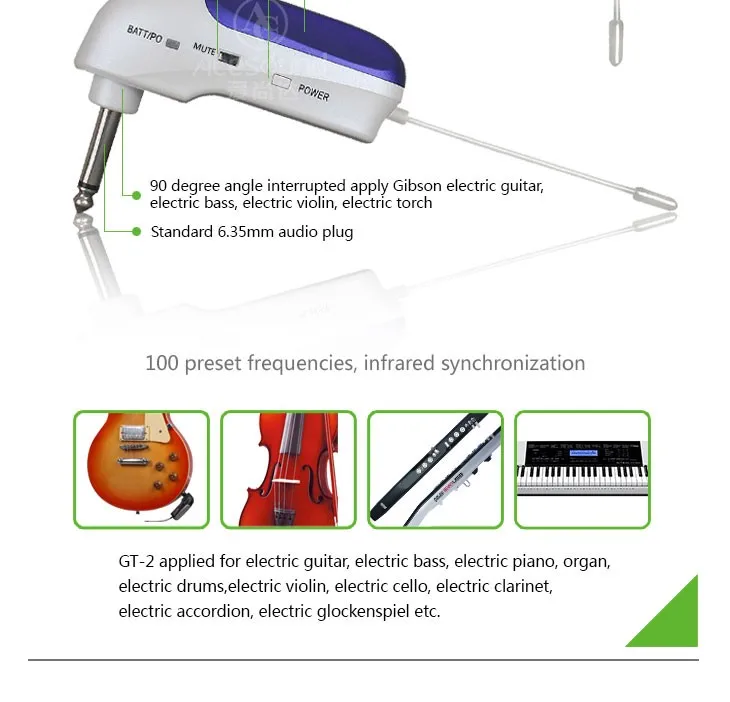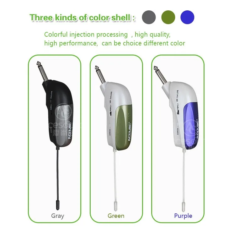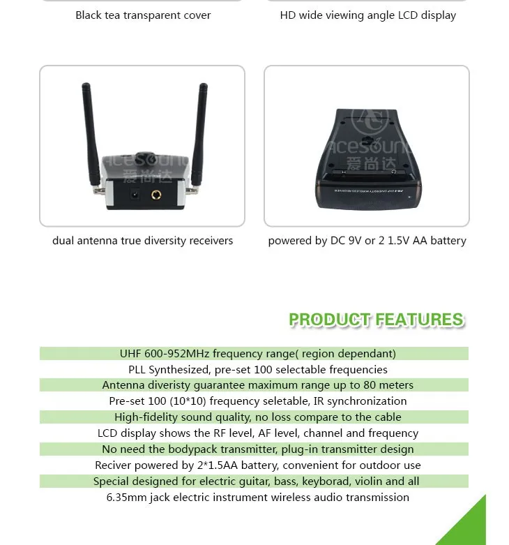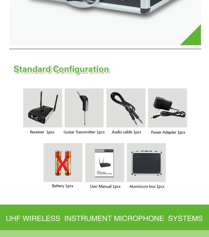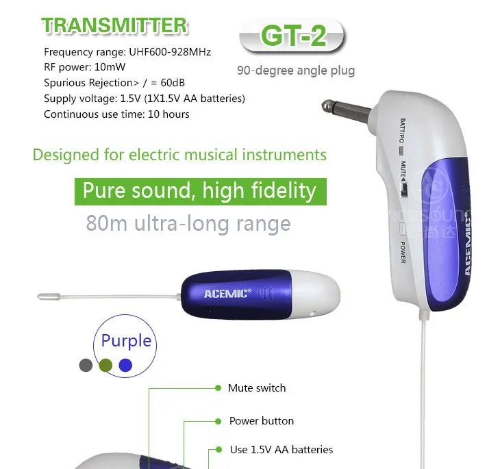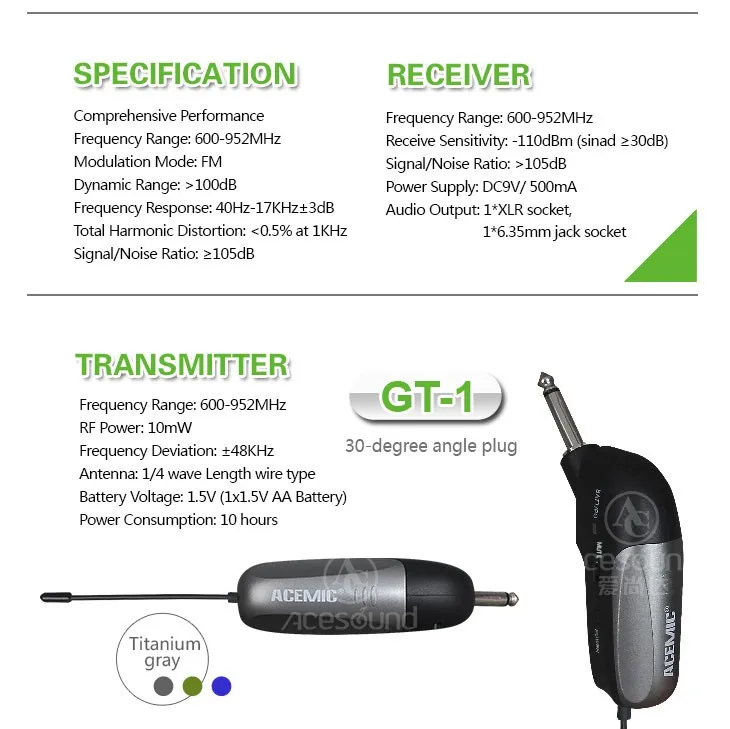 ACEMIC PR-8/GT-1 PR-8/GT-2 сценическое разнообразие Беспроводная электрическая гитара Бас фортепиано voilin барабаны Виолончель кларнет аккордеон MIC systemПримечание: Беспроводная Рабочая частота: 665 МГц-690 МГцОсобенностиUHF 665 МГц-690 МГц частотный диапазон (зависит от региона)PLL синтезированный, предварительно установленный 100 выбираемых частотАнтенна diveristy гарантирует максимальный диапазон до 80 метровПредварительный набор 100 (10*10) частота, синхронизация ИКВысокое качество звука, отсутствие потери по сравнению с кабелемЖК-дисплей показывает уровень RF, уровень AF, канал и частотуНет необходимости в передатчике бодипака, дизайн подключаемого передатчикаРесивер питается от 2 * 1.5AA батареи, удобный для использования на открытом воздухеСпециально разработан для электрогитары, бас, keyborad, скрипки и всех6,35 мм jack электрический прибор беспроводную передачу звукаСпецификацияКомплексная производительностьЧастотный диапазон: 665 МГц-690 МГцРежим модуляции: FMДинамический диапазон: >100 дБЧастотная характеристика: 40 Гц-17 кГц ± 3 дБОбщее гармоническое искажение: <0.5% при 1 кГцСоотношение сигнал/шум: ≥ 105дБПриемникЧастотный диапазон: 665 МГц-690 МГцЧувствительность приема: -110 дБм (sinad ≥ 30 дБ)Соотношение сигнал/шум: >105 дБИсточник питания: DC12V/ 500mAАудио Выход: 1 * гнездо XLR, 1*6,35 мм разъемПередатчикЧастотный диапазон: 665 МГц-690 МГцМощность RF: 10 мВтОтклонение частоты: ± 48 кГцАнтенна: 1/4 длина волны тип проводаБатарея Напряжение: 1,5 V (1x1,5 V AA Батарея)Потребляемая мощность: 10 часов, зависит от аккумулятора