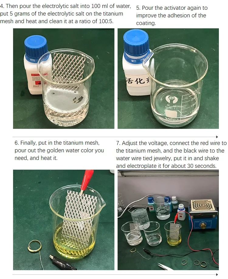 Шаги по эксплуатации1. Сначала нанесите воск на тканевое колесо для полировки.2. Используйте ультразвуковую очистку.3. Налейте стакан воды для легкой очистки.4. Затем Налейте электролитическую соль в 100 мл воды, положите 5 граммов электролитической соли на титановую сетку и Нагрейте и очистите ее в соотношении 100:5.5. Налейте активатор снова, чтобы улучшить адгезию покрытия.6. Наконец, положите в титановую сетку, вылейте золотой цвет воды, который вам нужен, и Нагрейте его.7. Отрегулируйте напряжение, подключите красный провод к титановой сетке, а черный провод к воде, завязанному ювелирному изделию, встряхните его и прижмите к нему электроплиту около 30 секунд.