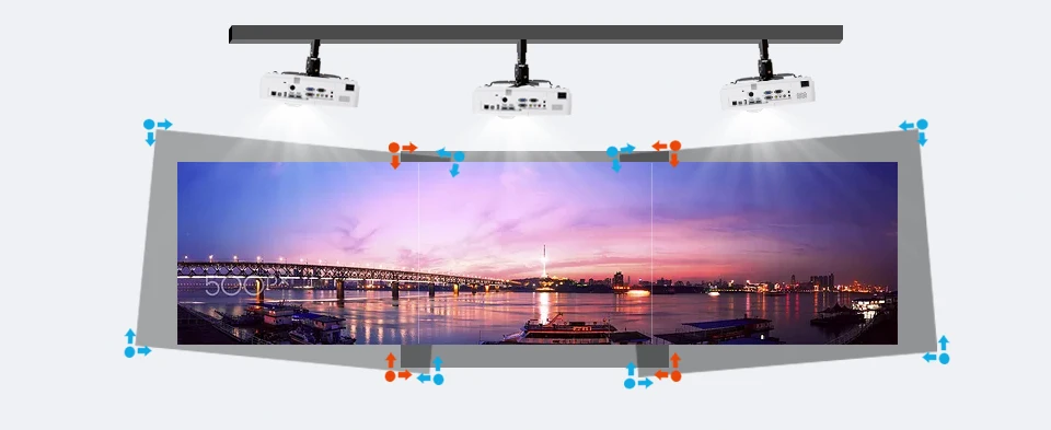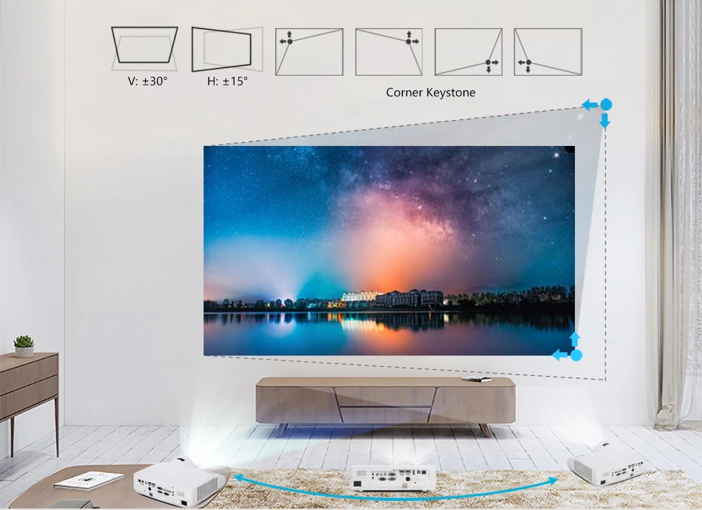 Большой экран fusion Если проектор установлен неправильно, а положение проекционного изображения неправильное, экран не может предохранить изображение. Не волнуйтесь. Вы можете отрегулировать изображение, регулируяУгловой трапецеидальных искаженийКоррекция, которая может идеально решить проблему установки и достичь большого экрана fusion.