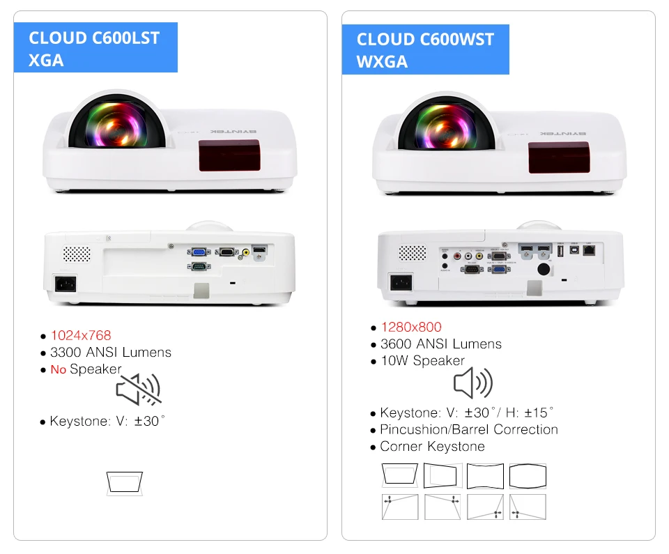 C600LST(XGA):V по вертикали: ± 30 ° (ручная), itПоддерживает только вертикальную коррекцию трапецеидального ключа