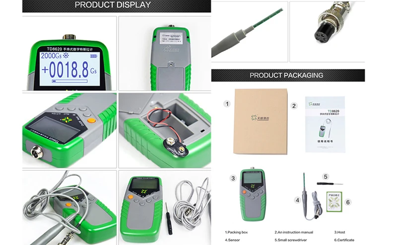TD8620 Ручной цифровой измеритель Tesla принимает не только высокочувствительный Датчик Холла и чип преобразования A / D с высоким разрешением, но и популярную однокристальную компьютерную технологию и технологию цифровой фильтрации.