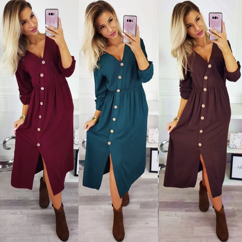 Горячая Распродажа, женское сексуальное платье с v-образным вырезом, 2018, женская пляжная одежда, с пуговицами и карманами, миди, свободное платье, праздничное винтажное осеннее однотонное платье с длинным рукавом!
