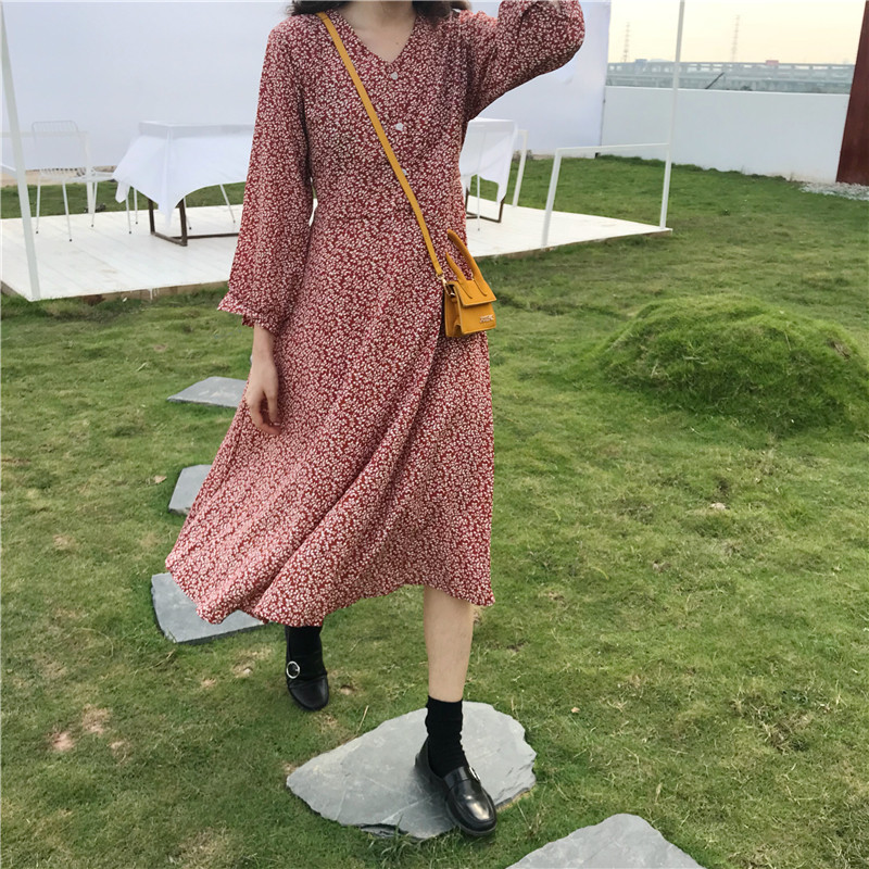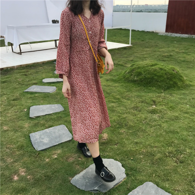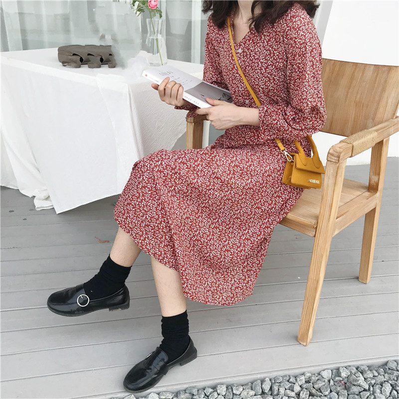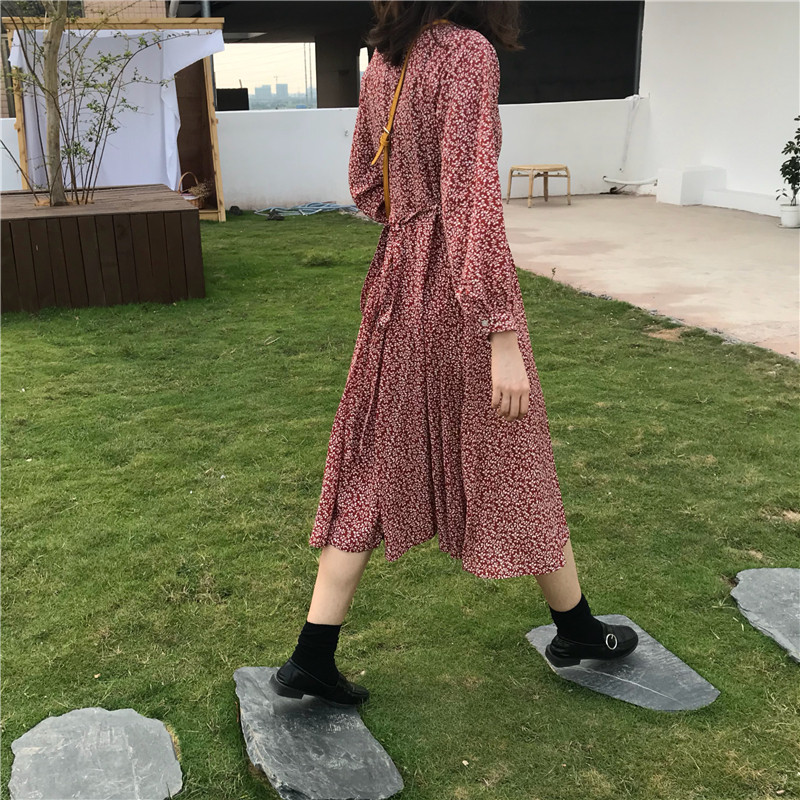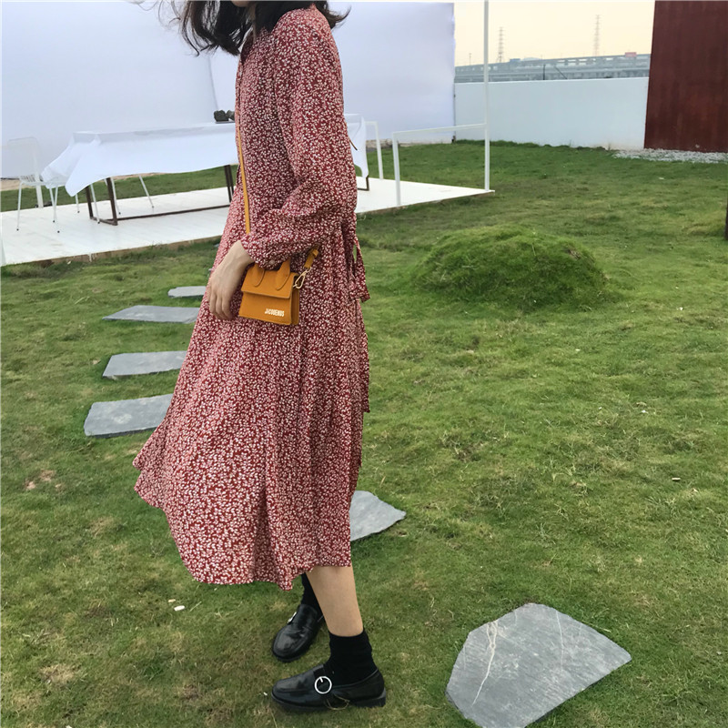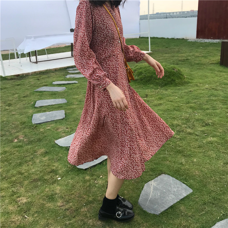 Осеннее платье 2018 женское с цветочным принтом свободное шифоновое длинное платье повседневное платье с длинным рукавом женское s