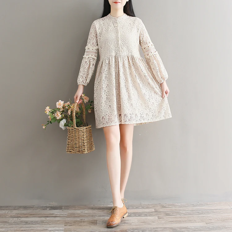 Mori Girl Robe Femme, весенние элегантные винтажные платья с круглым вырезом и бусинами, рукав-фонарик, высокая талия, кружевное лоскутное мини-платье AF826