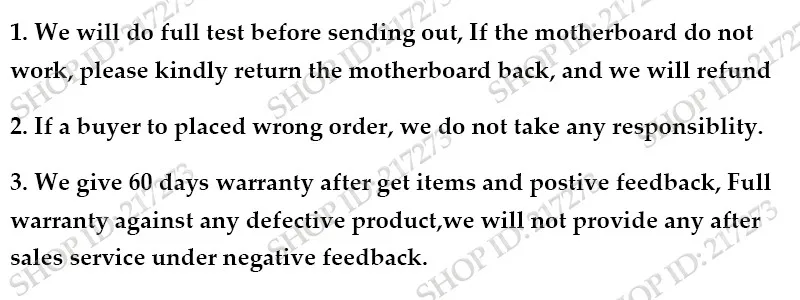 1: материнская плата такая же, как на фотографиях. 2: полный тест перед отправкой. 3: предоставляем 2 месяца гарантии. (старт после получения посылка)