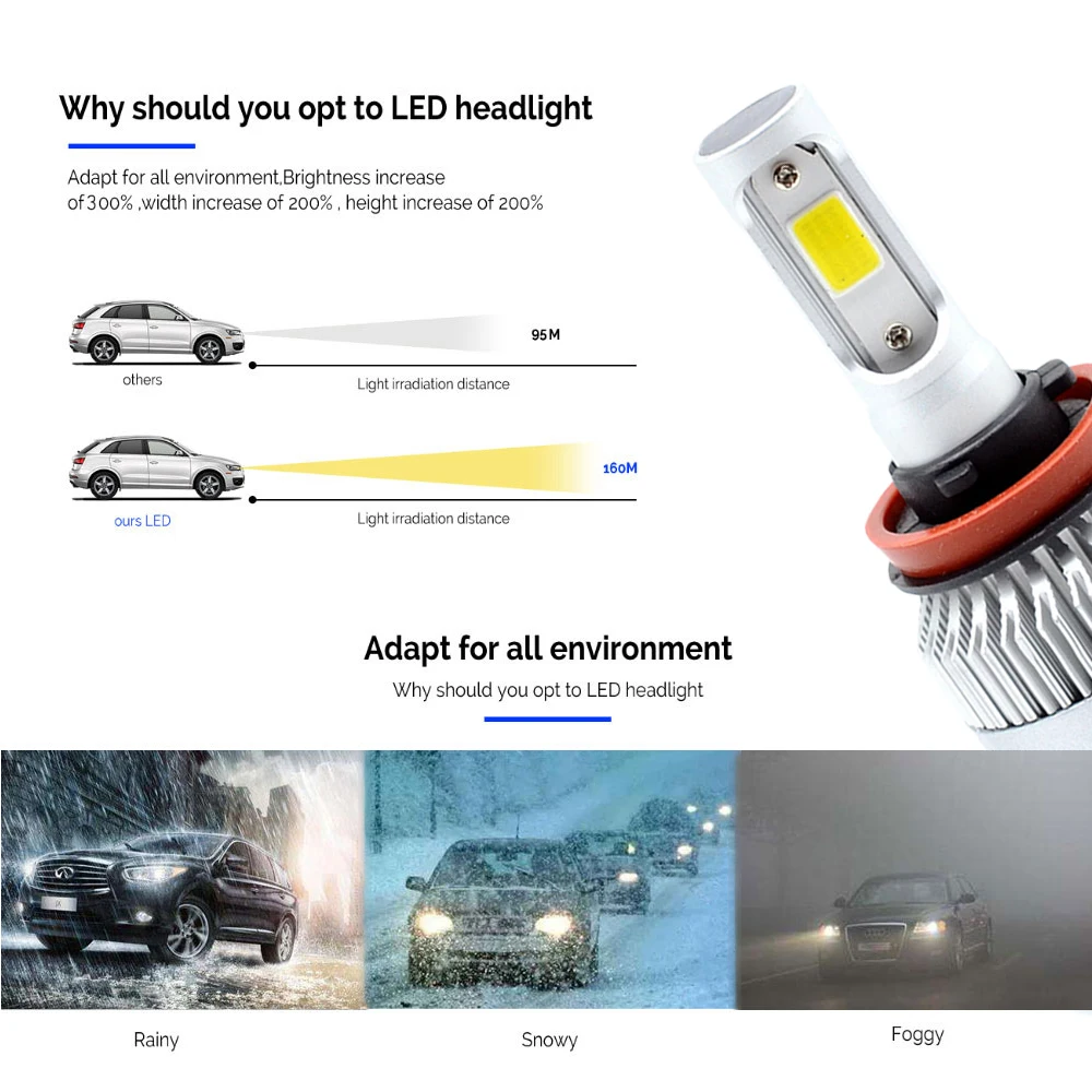 9006(HB4), Одиночный луч (72 Вт/комплект, 36 Вт/лампа) 9005(HB3), Одиночный луч (72 Вт/комплект, 36 Вт/лампа) H11, Одиночный луч (72 Вт/комплект, 36 Вт/лампа) H7, Одиночный луч (72 Вт/комплект, 36 Вт/лампа) H1, однолучевая (72 Вт/комплект, 36 Вт/лампа) H3, однолучевая (72 Вт/комплект, 36 Вт/лампа) 9012, Одиночный луч (72 Вт/комплект, 36 Вт/лампа) Мощность: 72 Вт/комплект Световой поток: 8000лм/комплект (4000лм/лампа) Рабочее напряжение: 9-32 В постоянного тока (подходит для транспортных средств 12 В, 24 В) Цветовая температура: чистый белый 6500K IP65 Номинальное уплотнение воды и пыли, угол луча 360 градусов Материал: авиационный 6063 алюминиевый профиль Рабочая температура: -40-80 градусов Цельсия Срок службы более 300 часов Использование: фара,Противотуманный светильник Двусторонний канал рассеивания тепла 1. Все-в-одном алюминиевый профиль в качестве теплопроводящей системы, 360 градусов тепло излучение 2. Высокоскоростной бесшумный вентилятор (12000р/мин), высокий поток воздуха для более быстрого охлаждения Посылка включает в себя: 2x светодиодный лампы для фар 1x руководство по установке на английском языке