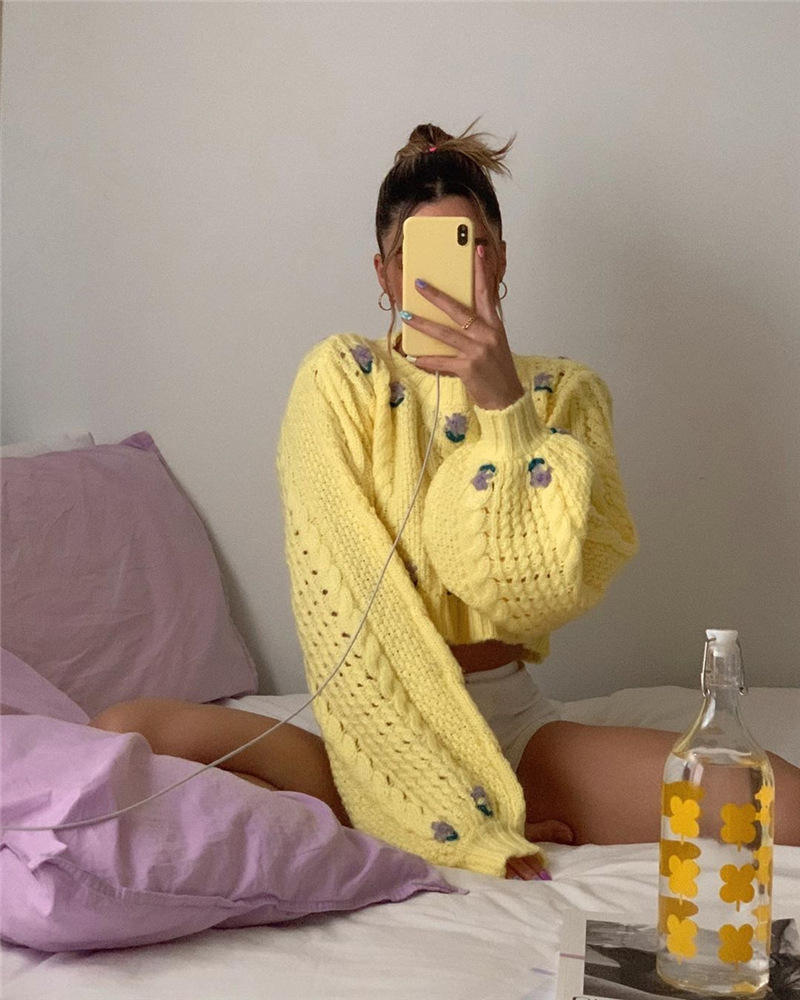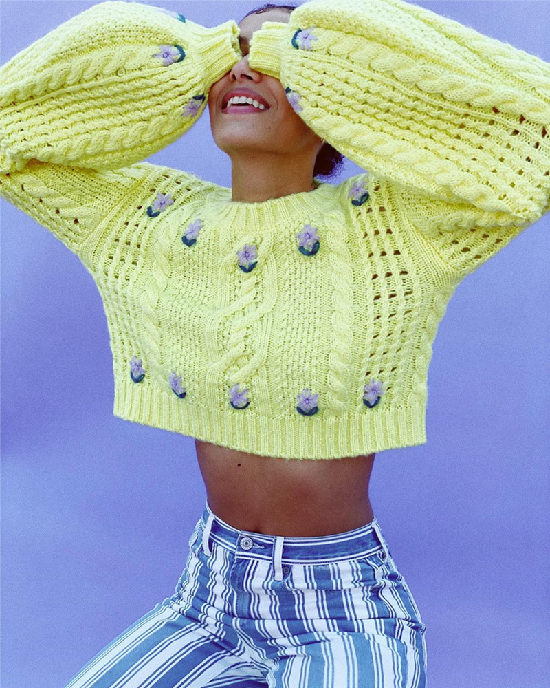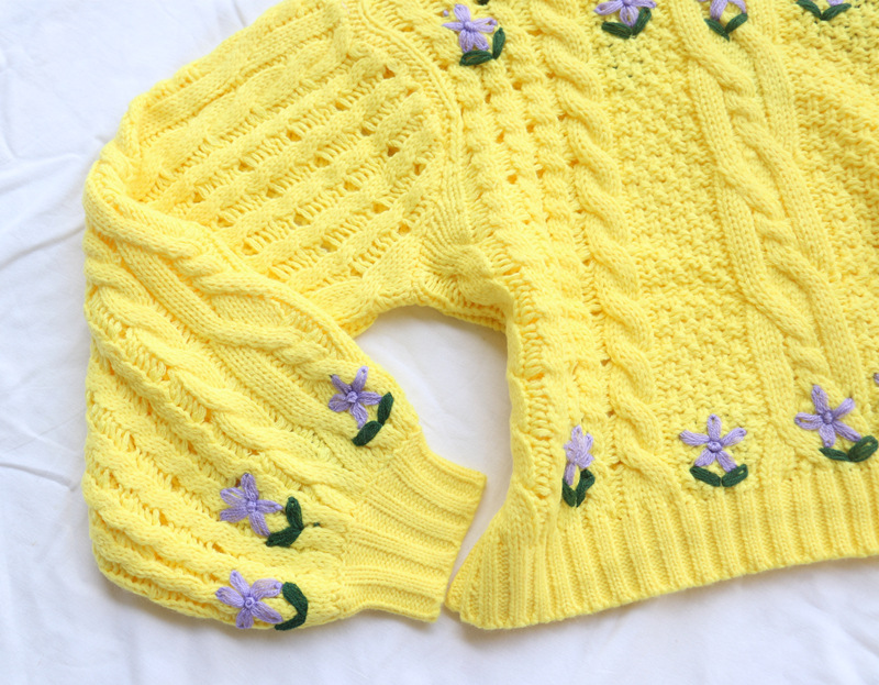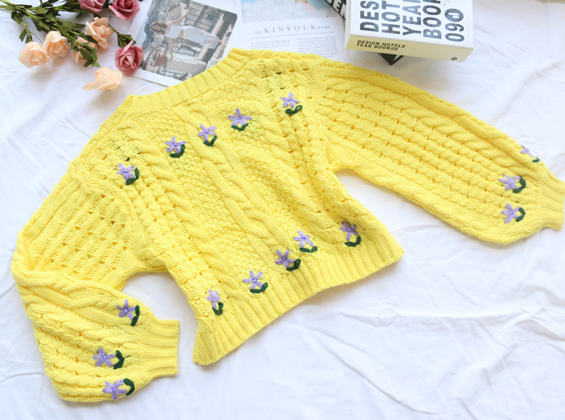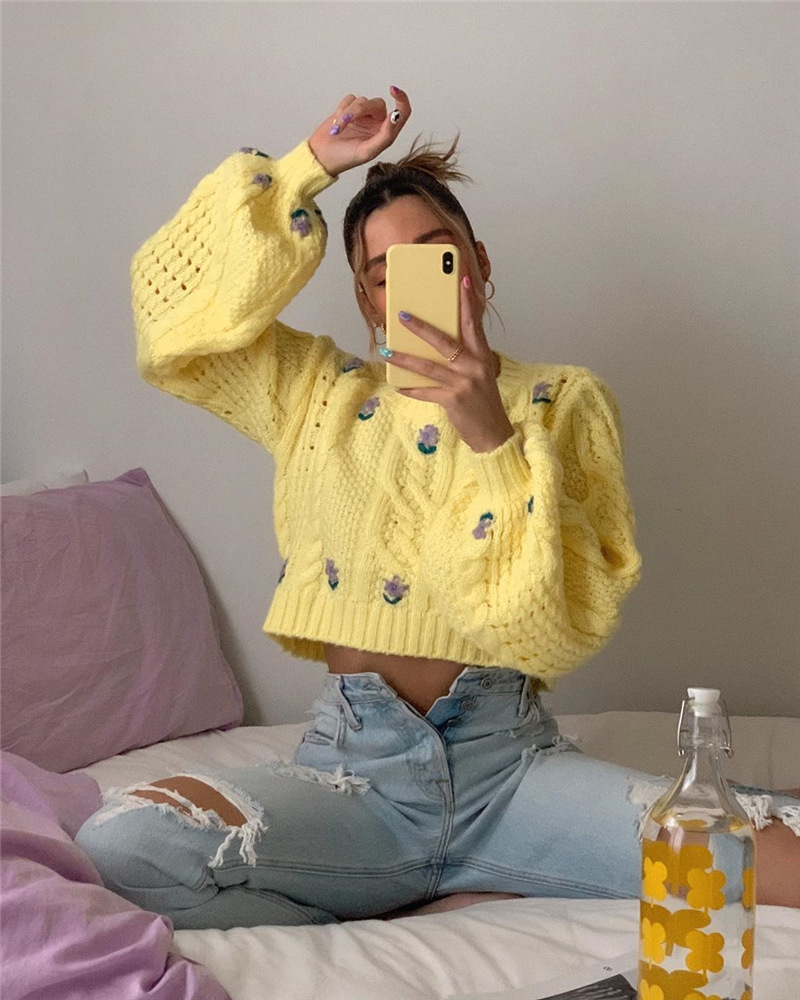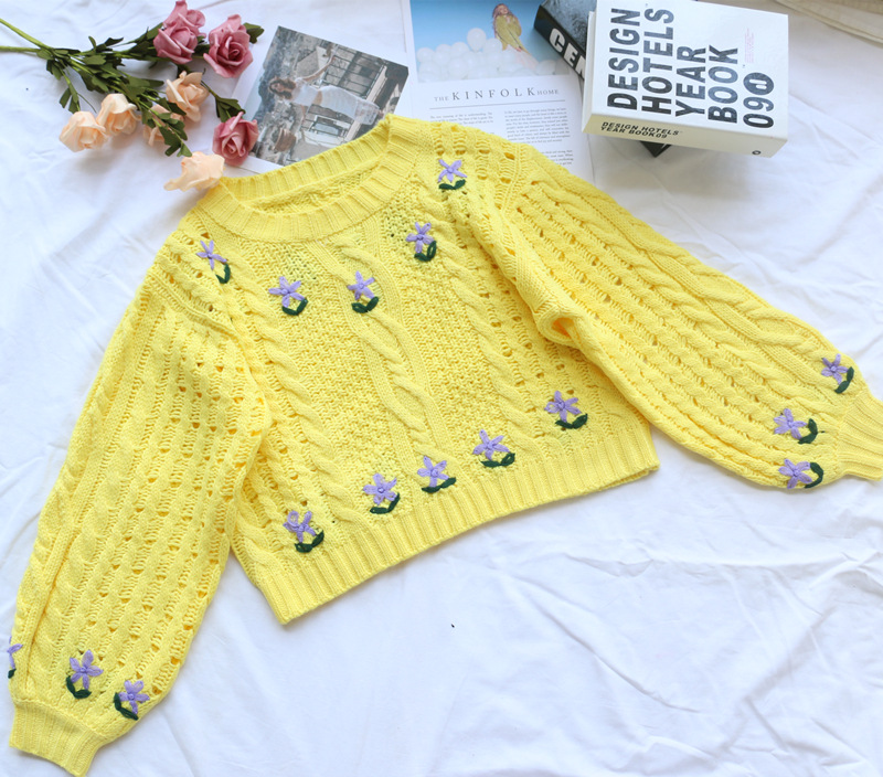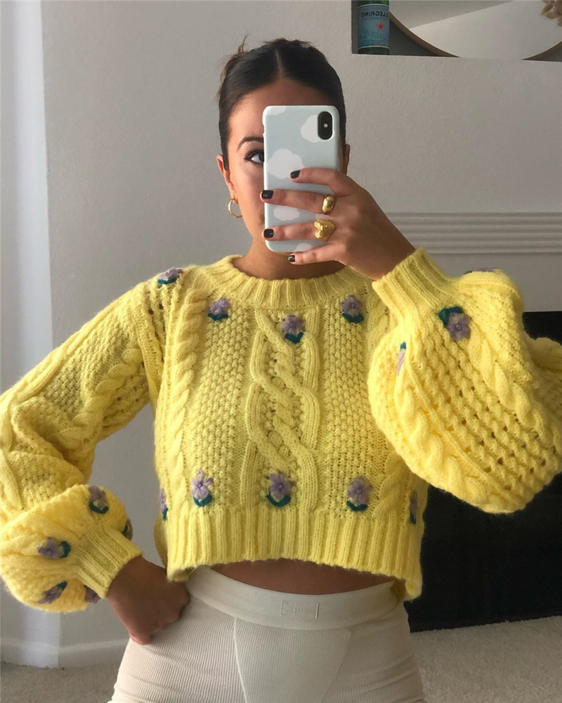 Женские свитера с круглым вырезом, с длинным рукавом-фонариком, с цветочным узором, вязаный укороченный топ
