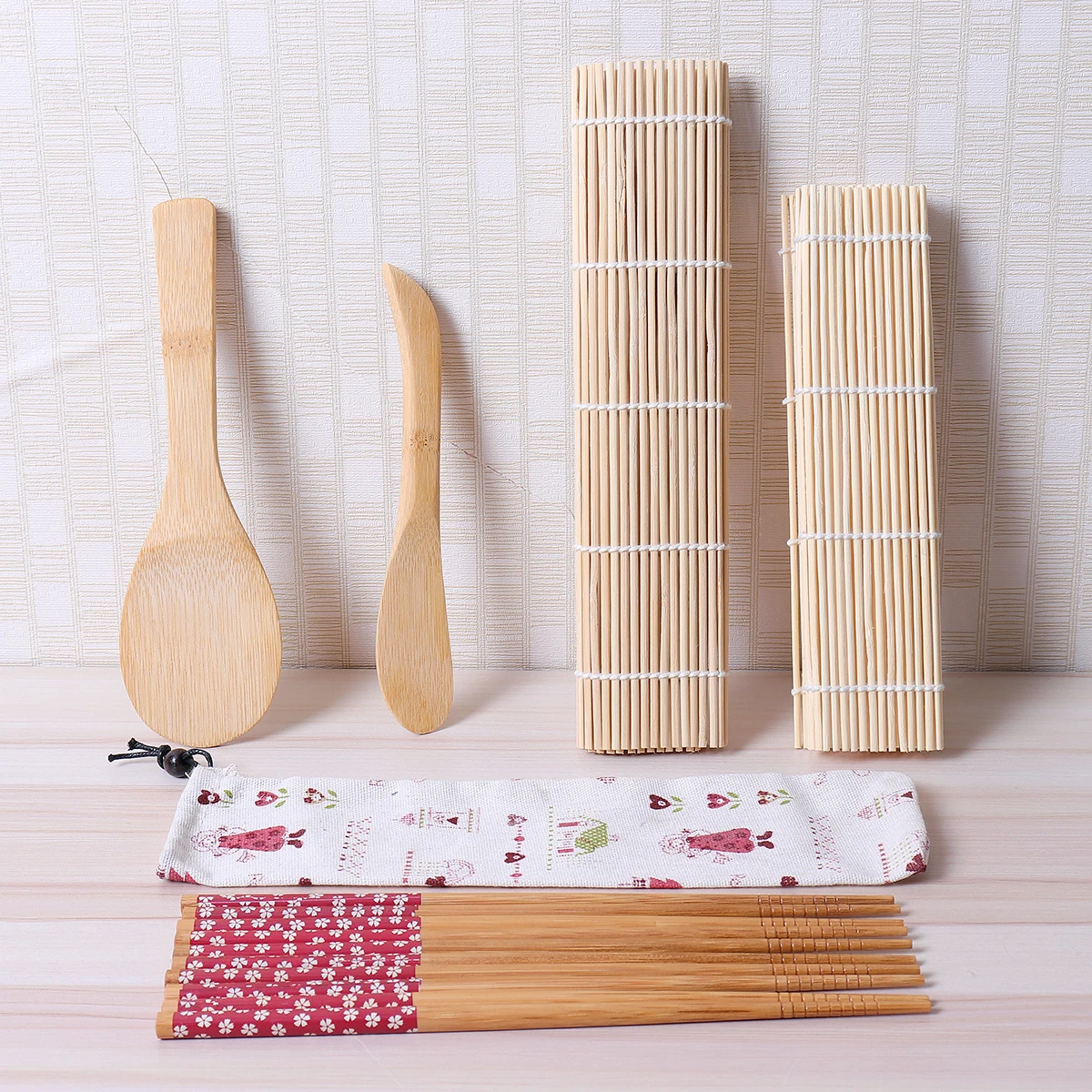Этот набор инструментов для приготовления суши сделан из натурального бамбука, не только включает в себя базовые инструменты для приготовления суши, но и содержит 5 пар витых палочек для еды.