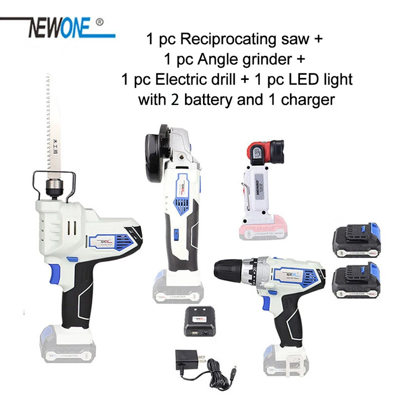 Kit1:1 шт. дрель + 1 шт. угловая шлифовальная машина + 1 шт. возвратно-поступательная пила + 1 шт. светодиодный светильник + 2 шт. 2000 мАч аккумуляторные батареи + быстрое зарядное устройство
