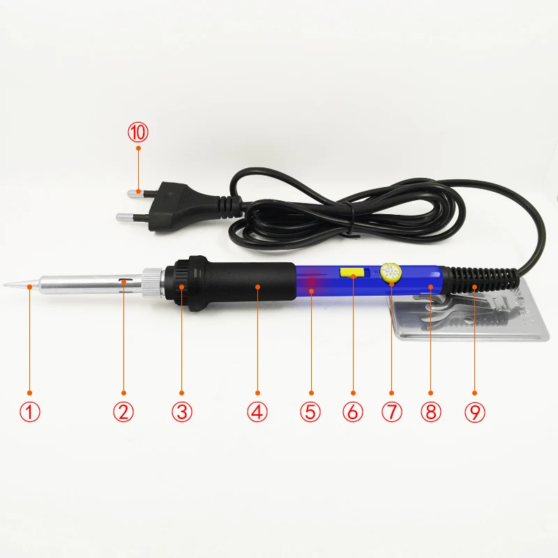1. Головка паяльника 2. Металлический стержень 3. Теплоизоляционный клей 4. Резиновая ручка 5. Светодиодный светильник 6. Выключатель питания 7. Контроль температуры 8. Изоляция корпуса 9. Эластичная защита 10,1 М ЕС вилка правила линии