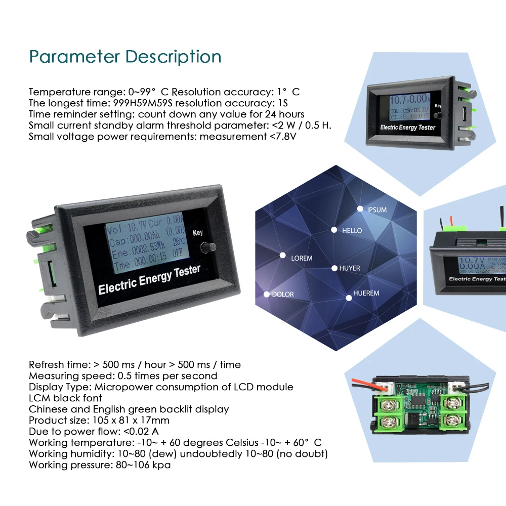 Мощность накопление диапазон: 0 ~ 9999,9 Wh точность разрешения: 0,01 Wh