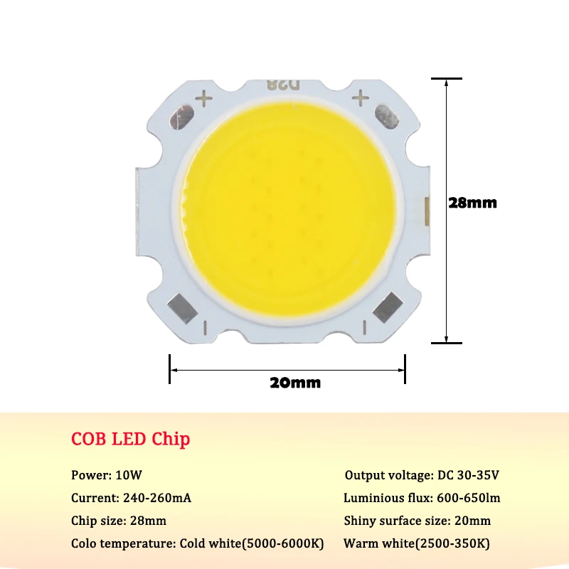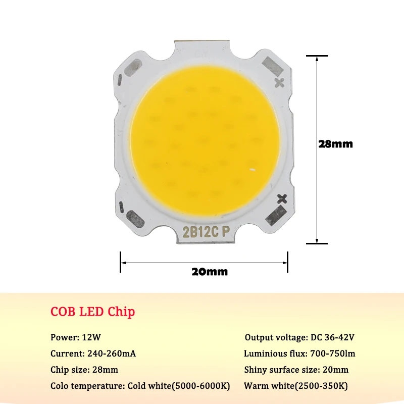 2. Есть два размера светодиодного чипа COB! Один 28 мм (3 Вт, 5 Вт, 7 Вт, 10 Вт,12 Вт, 15 Вт).