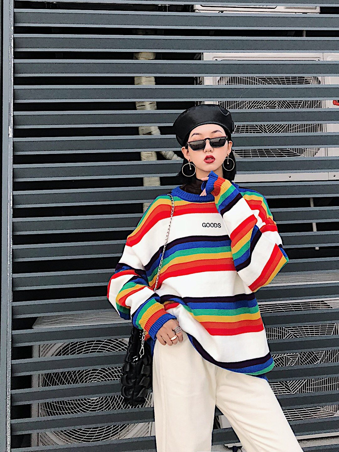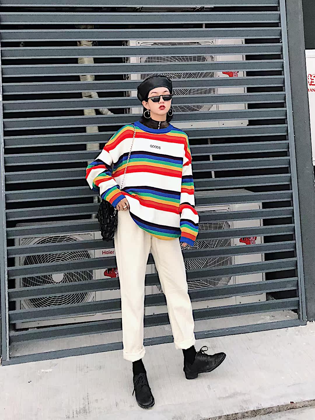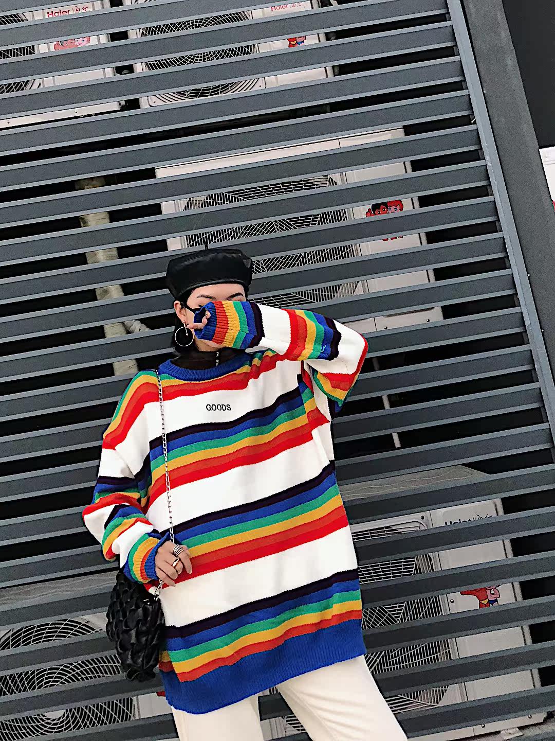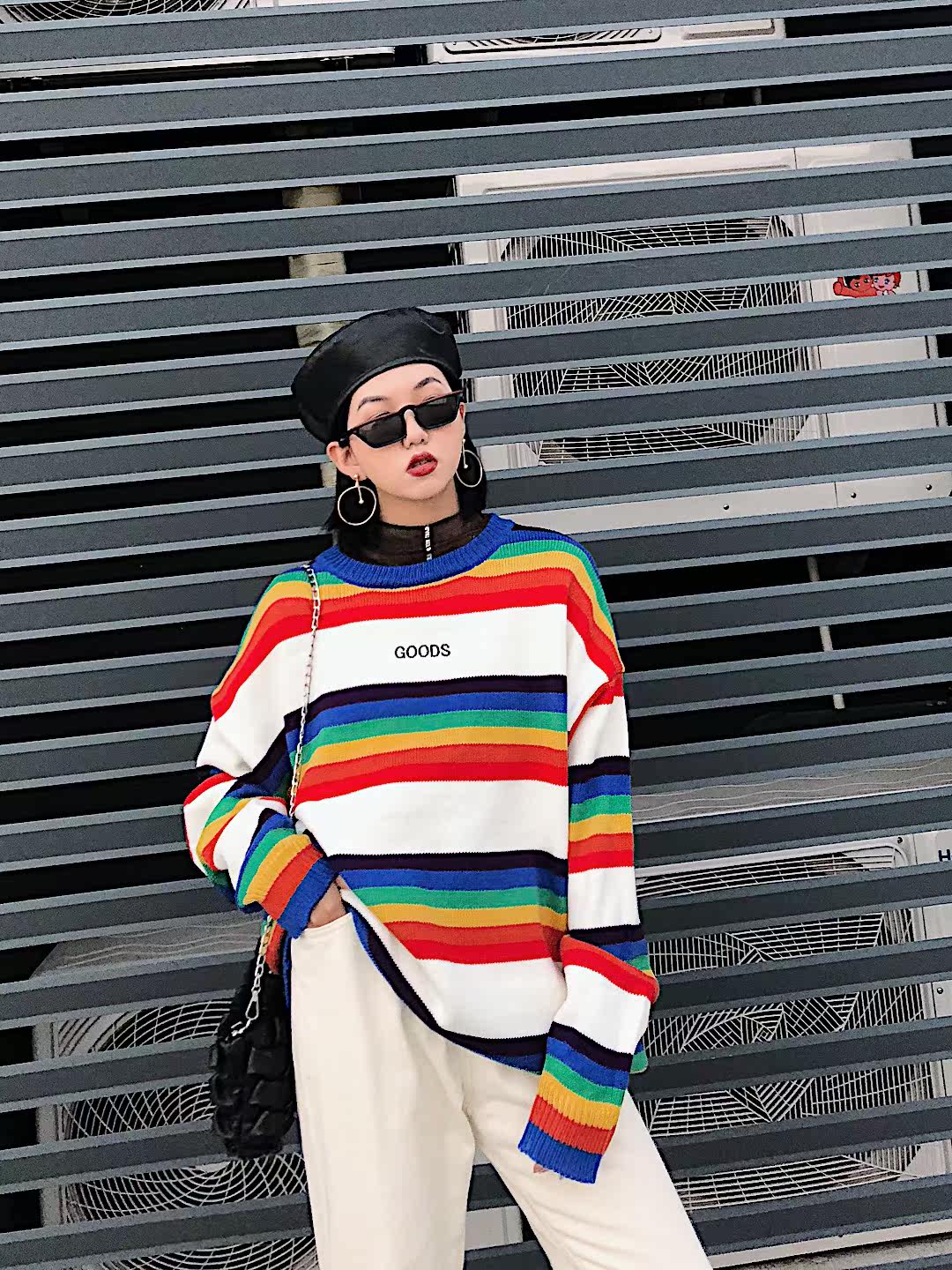 品牌: jasummer吸睛率杠杠的彩虹毛衣终于来啦这款毛衣可谓是颜值zuei佳了彩色的条纹拼接带有层次感也有立体感圆领的设计时尚有型领口弹力上佳方便穿脱整体没有多余的图案装饰衣前一个字母词汇点缀了潮流感版型宽松休闲穿上不会臃肿不会显垮平时出门再套上一件外套或马甲也是好看哒衣服上身效果不错轻松自在 穿衣追求的就是好看的外表和舒适的体验这款毛衣值得试一试说不定就有了另一番别样的feel黑色和白色都是jing典的颜色搭配方面可参考我们的小v |