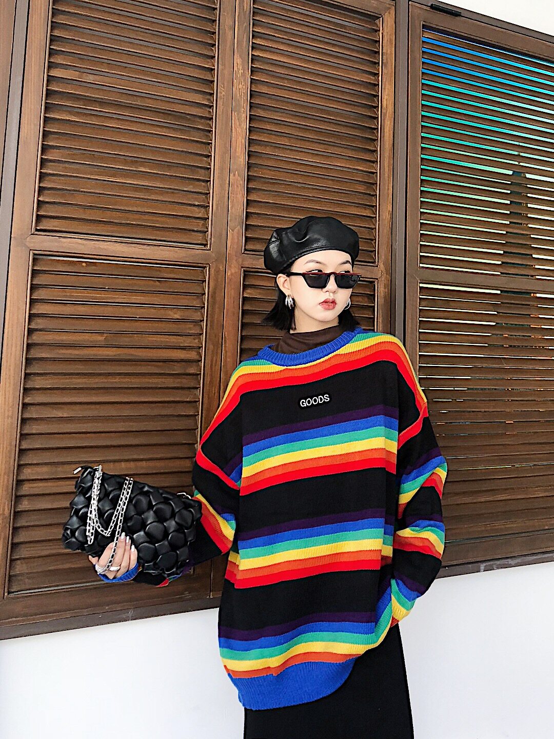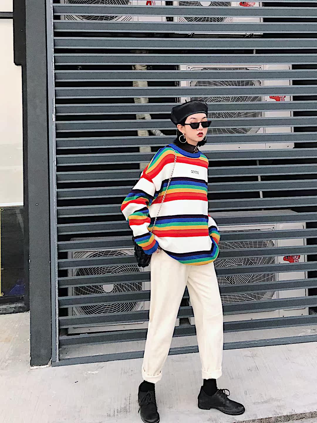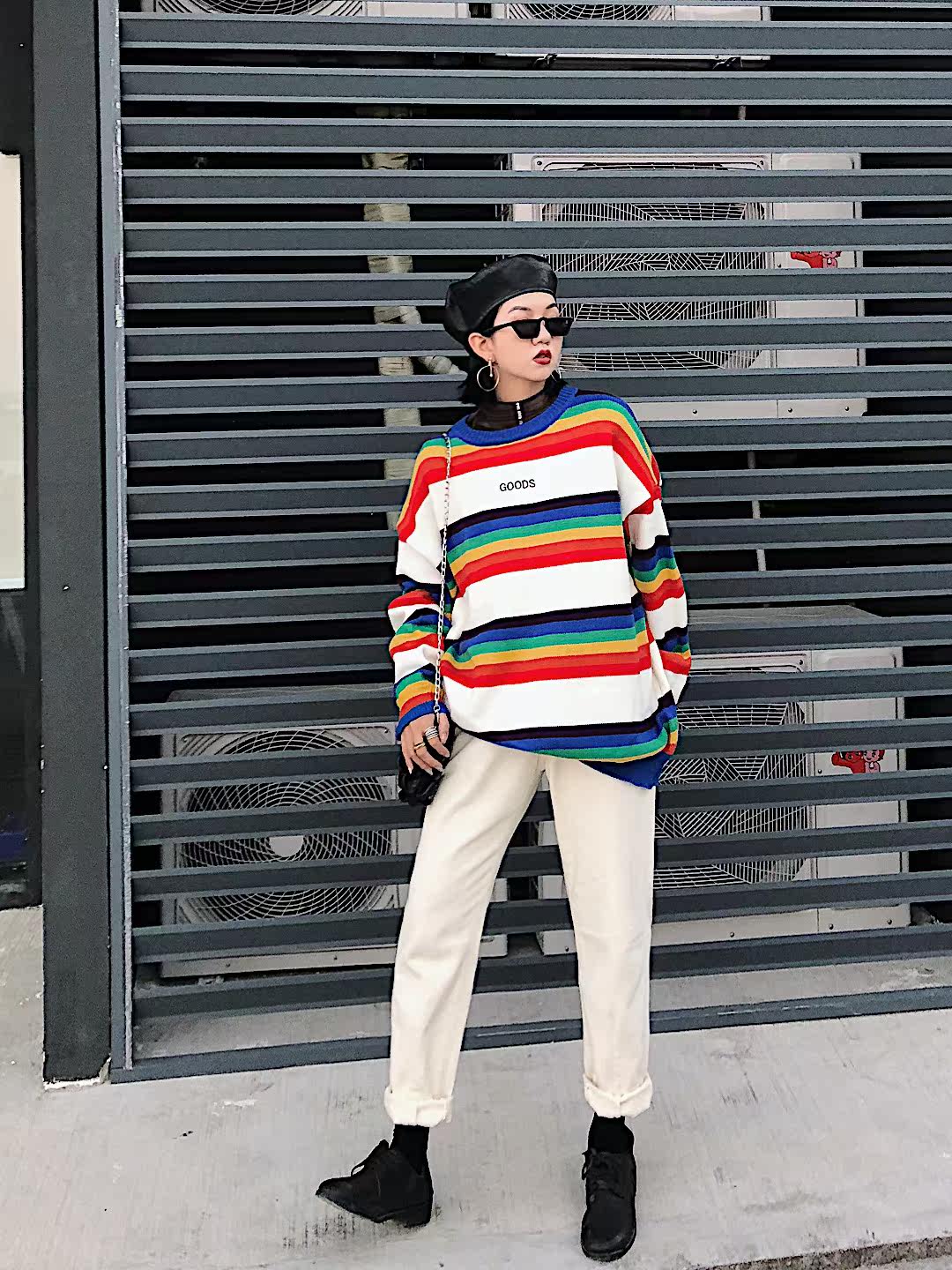 品牌: jasummer吸睛率杠杠的彩虹毛衣终于来啦这款毛衣可谓是颜值zuei佳了彩色的条纹拼接带有层次感也有立体感圆领的设计时尚有型领口弹力上佳方便穿脱整体没有多余的图案装饰衣前一个字母词汇点缀了潮流感版型宽松休闲穿上不会臃肿不会显垮平时出门再套上一件外套或马甲也是好看哒衣服上身效果不错轻松自在 穿衣追求的就是好看的外表和舒适的体验这款毛衣值得试一试说不定就有了另一番别样的feel黑色和白色都是jing典的颜色搭配方面可参考我们的小v |