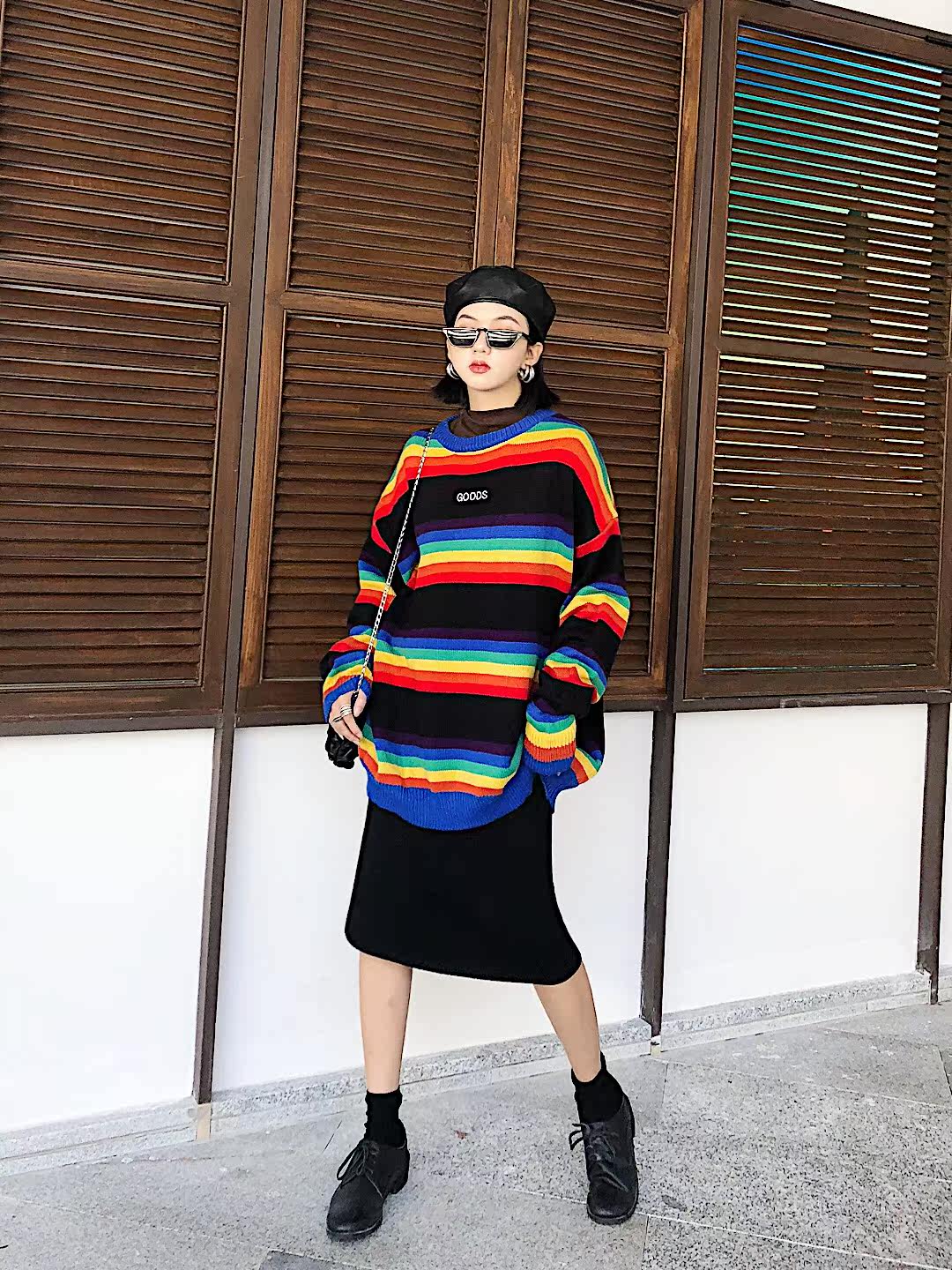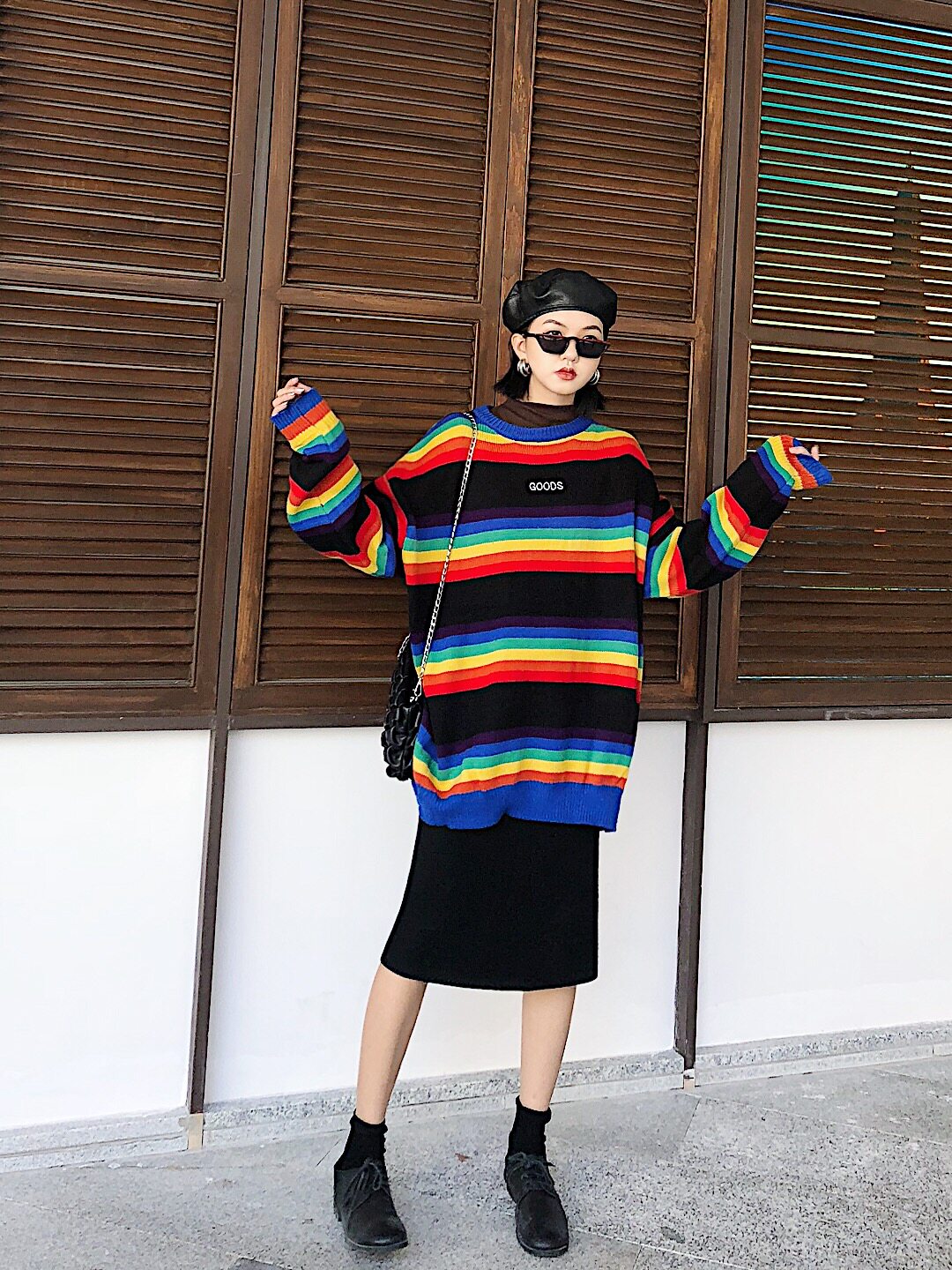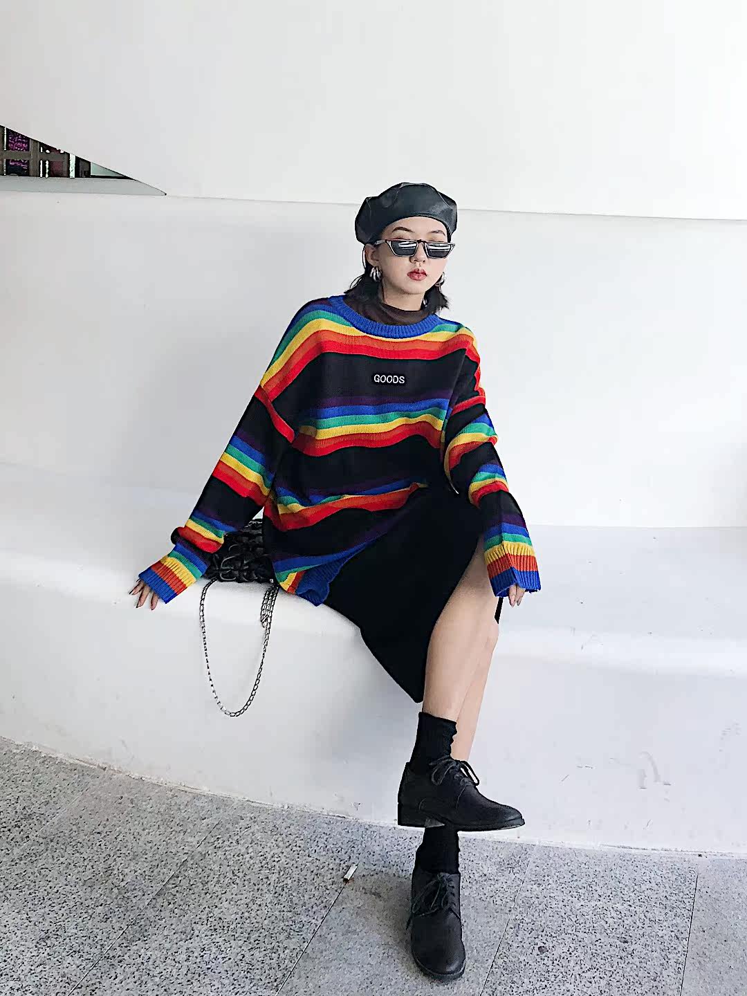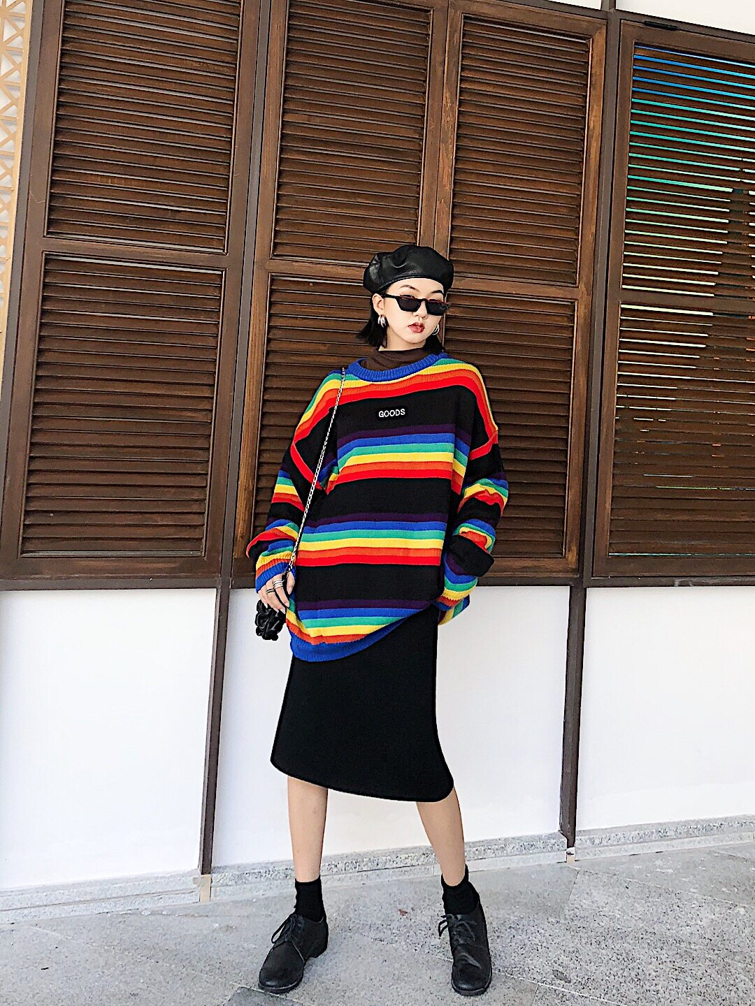 品牌: jasummer吸睛率杠杠的彩虹毛衣终于来啦这款毛衣可谓是颜值zuei佳了彩色的条纹拼接带有层次感也有立体感圆领的设计时尚有型领口弹力上佳方便穿脱整体没有多余的图案装饰衣前一个字母词汇点缀了潮流感版型宽松休闲穿上不会臃肿不会显垮平时出门再套上一件外套或马甲也是好看哒衣服上身效果不错轻松自在 穿衣追求的就是好看的外表和舒适的体验这款毛衣值得试一试说不定就有了另一番别样的feel黑色和白色都是jing典的颜色搭配方面可参考我们的小v |