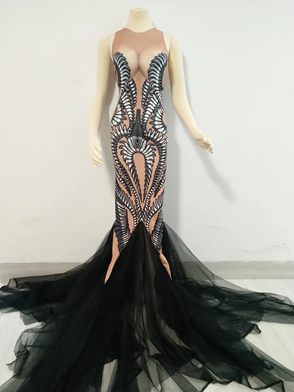 Вечерние платья для ночных клубов, костюм певицы, Черное длинное платье в сеточку, наряд для дня рождения, для праздника, для выступлений, стрейчевое платье для танцев