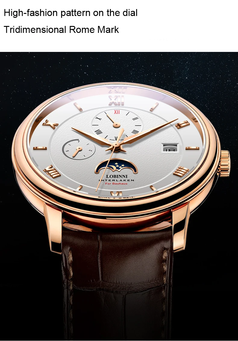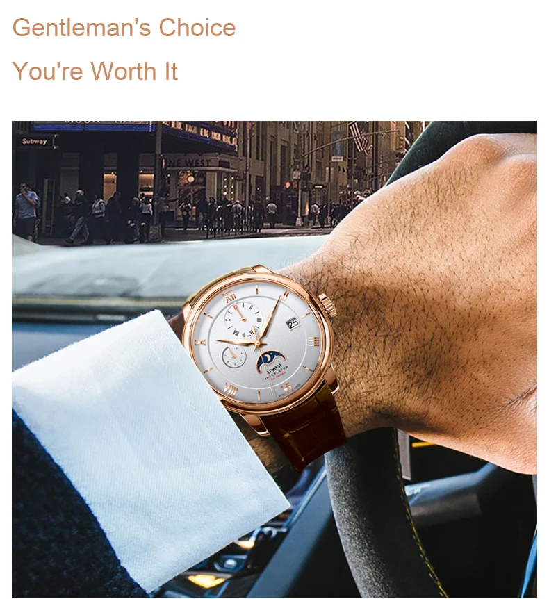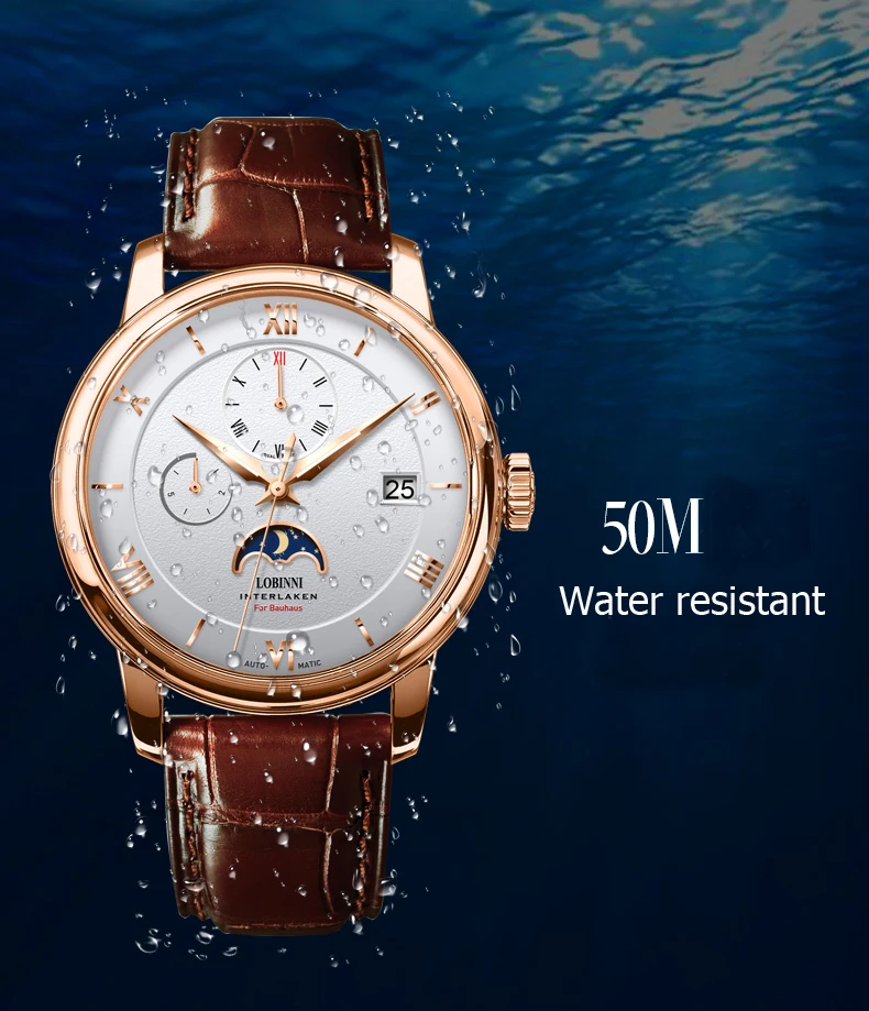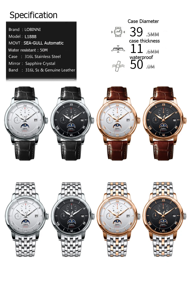 Посылка включает часы + LOBINNI box + Бесплатный товар (подарок) Характеристика: водонепроницаемость 50 м (подходит для плавания) Отображение даты/месяц/день недели/фаза Луны/светящиеся стрелки Более высокая производительность затрат: Чайка 28 драгоценностей движение/Сапфировое Окно 1 год ордер