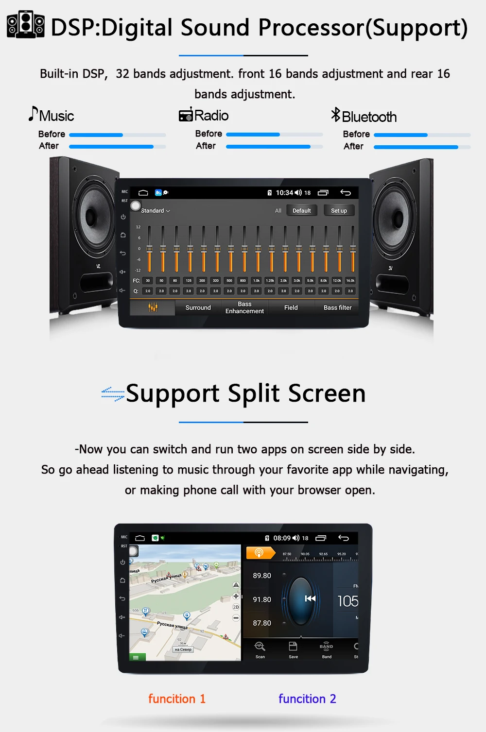 Оснащен мощным DSP + Hi-Fi чипом, TDA7851 4*50 Вт усилитель, может изменить звук с окружающей среды. Наслаждайтесь музыкой с dsp,