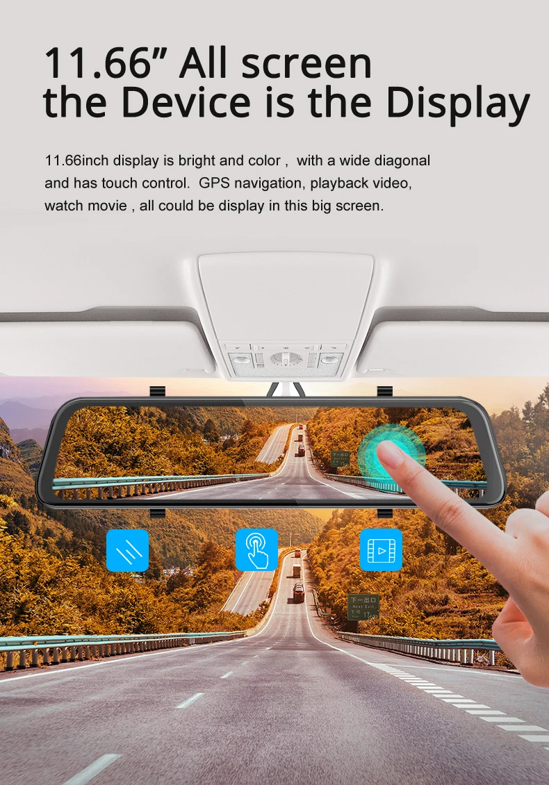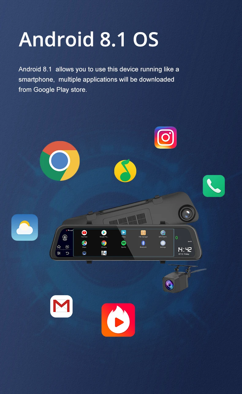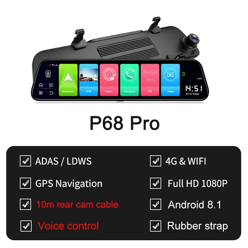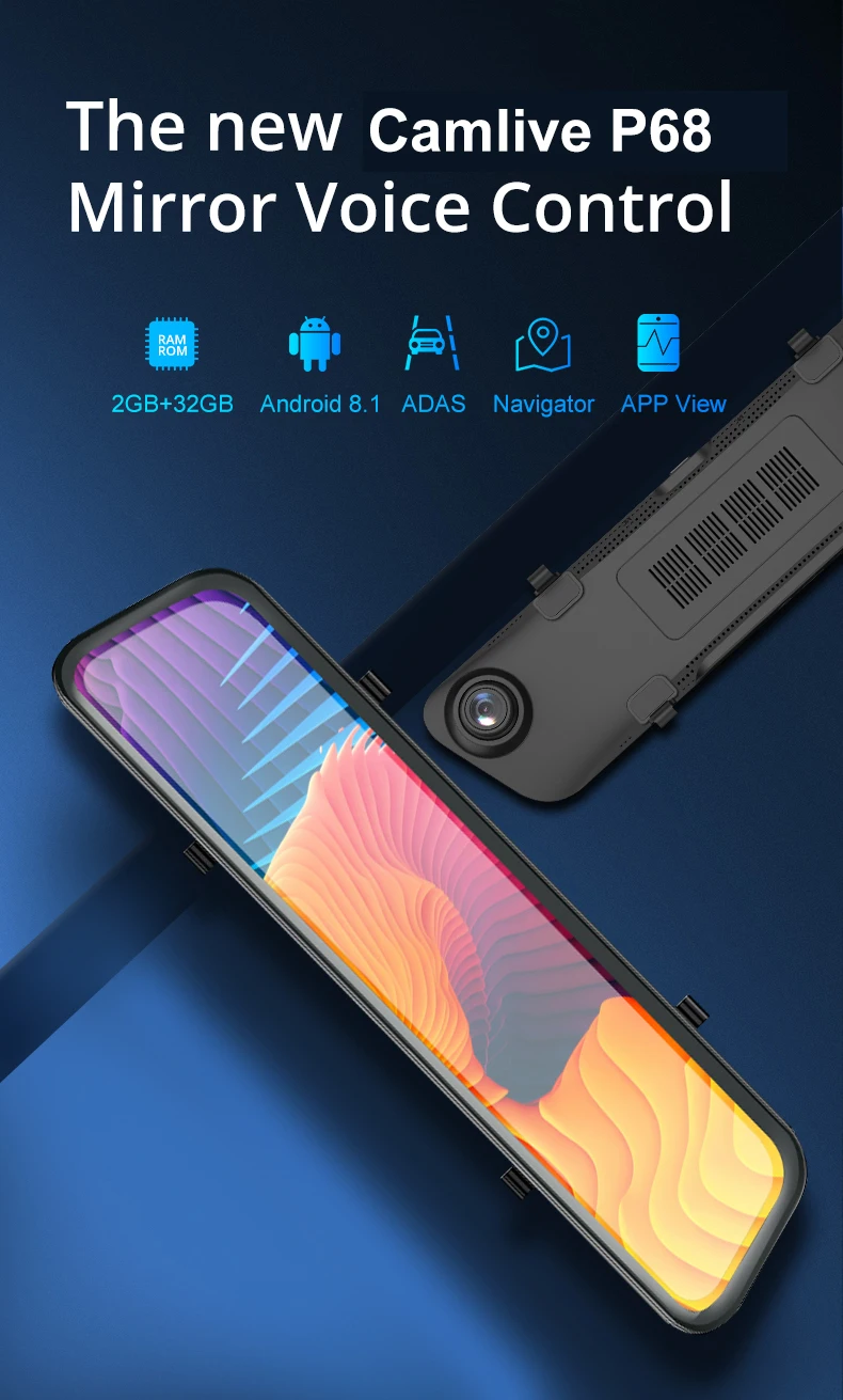 -12 дюймов IPS сенсорный экран -Android 8,1 с RAM2G и ROM32G -Удаленный монитор на телефоне -Gps-навигация -ADAS -Одновременная запись двух камер -Точка доступа WIFI -Обратная парковка -G-сенсор и циклическая запись -Угол обзора 165 градусов -Максимальная sd-карта 128G -Дополнительный кабель задней камеры 10 м -Специальное крепление для установки (опционально) -Camlive P68 Поддерживает голосовую команду в России, английском и вьетнамском языках