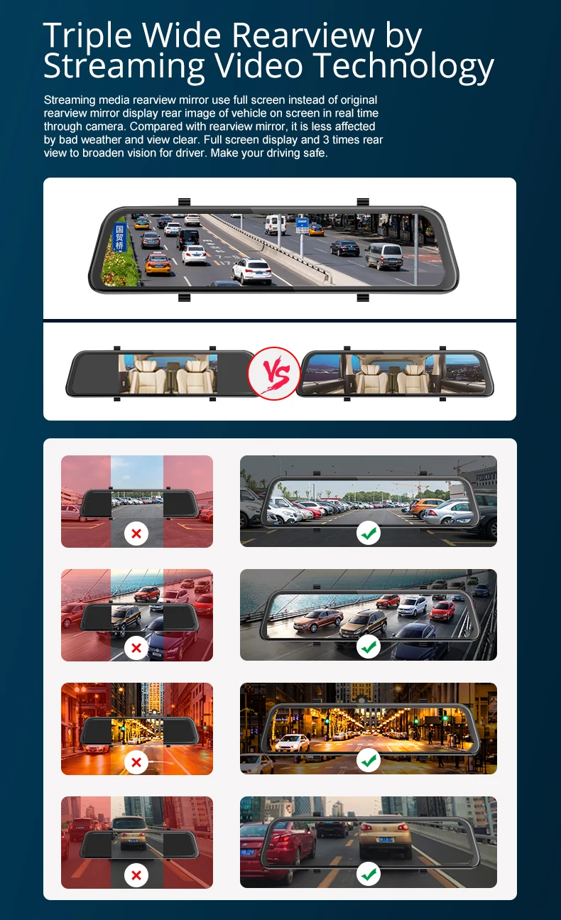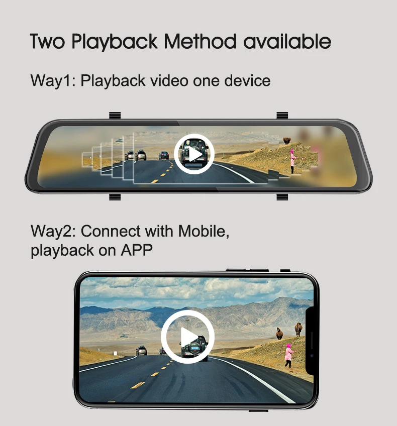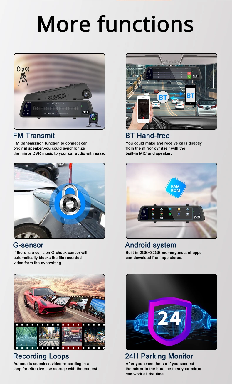 -12 дюймов IPS сенсорный экран -Android 8,1 с RAM2G и ROM32G -Удаленный монитор на телефоне -Gps-навигация -ADAS -Одновременная запись двух камер -Точка доступа WIFI -Обратная парковка -G-сенсор и циклическая запись -Угол обзора 165 градусов -Максимальная sd-карта 128G -Дополнительный кабель задней камеры 10 м -Специальное крепление для установки (опционально) -Camlive P68 Поддерживает голосовую команду в России, английском и вьетнамском языках