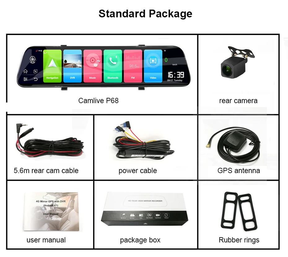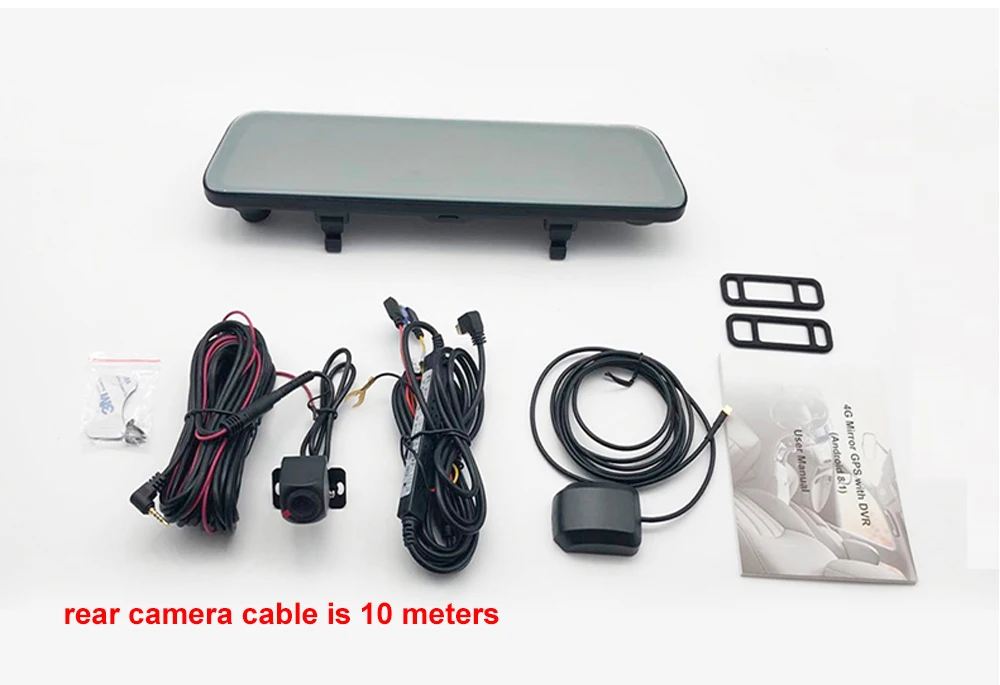 В комплект входят следующие детали: 1x P68 автомобильная камера 1x Кабель питания 1 задняя камера 1x кабель задней камеры 10 метров 1x GPS антенна 1x Руководство пользователя 2x резиновое кольцо для установки