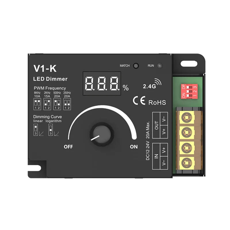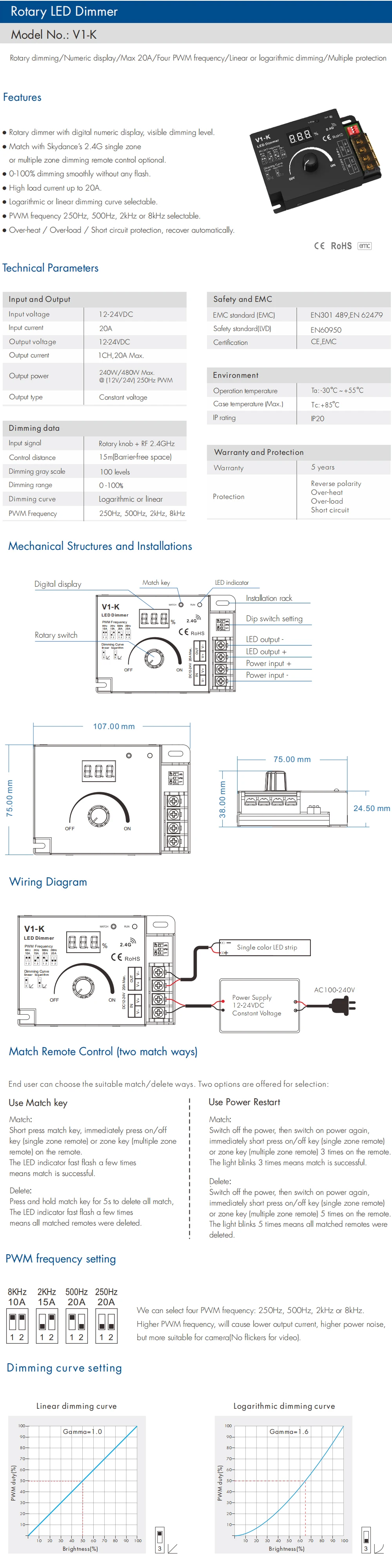 Особенности Цифровой цифровой дисплей, Видимый уровень затемнения. Высокая нагрузка тока до 20А. Примечание: Этот Диммер может работать с пультом дистанционного управления Skydance Логарифмическая или линейная кривая затемнения выбирается. PWM частота 250 Гц, 500 Гц, 2 кГц или 8 кГц выбор