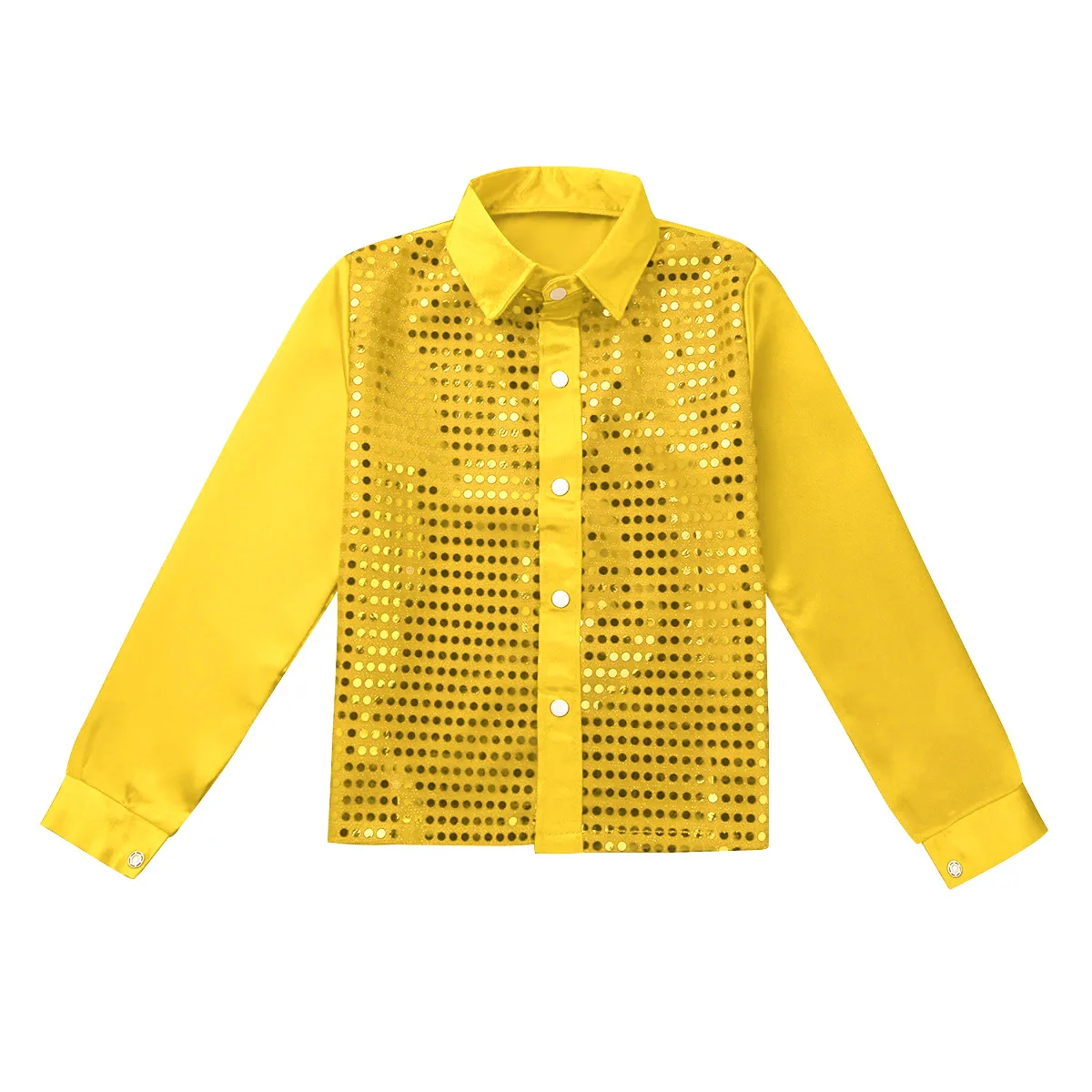 Длинные рукава, отложной воротник с лацканами, спереди украшен блестящими блестками.