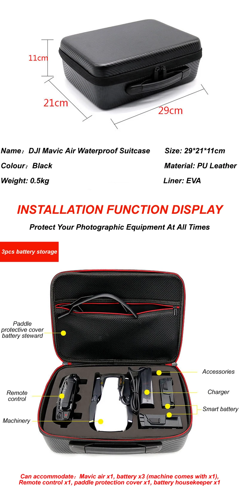 Особенности: Специально разработанный чехол/Сумка для DJI Mavic Air Drone и аксессуары Изготовлен из высококачественного материала, прочный и легкий Интерьер изготовлен из ЭВА, идеально подходит для защиты вашего DJI Mavic Air Двойная молния, может использоваться более 100 000 раз Ручной дизайн, портативный для переноски Спецификация: Материал: Твердый корпус из поликарбоната Размер: 29*12*22 см Вес: 0,75 кг
