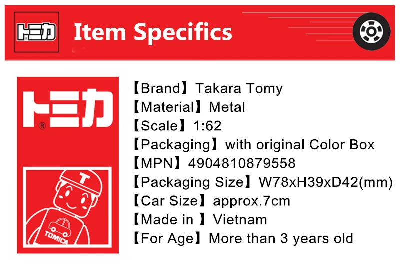 Номер товара. : 4904810879558 Производитель: TAKARATOMY Бренд: Tomica Размер посылка: W78 x H41 x D39 мм Целевой возраст: 3 года ~