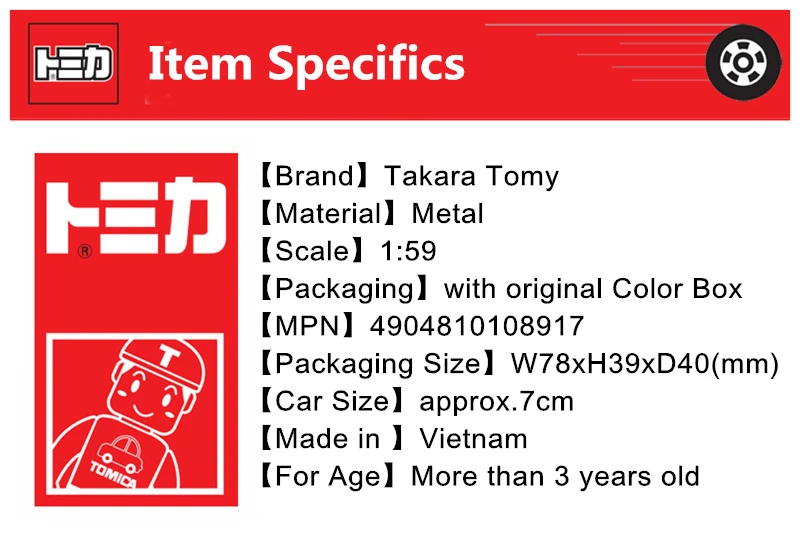 Номер товара. : 4904810108917 Производитель: TAKARATOMY Бренд: Tomica Размер посылка: W78 x H41 x D39 мм Целевой возраст: 6 лет ~