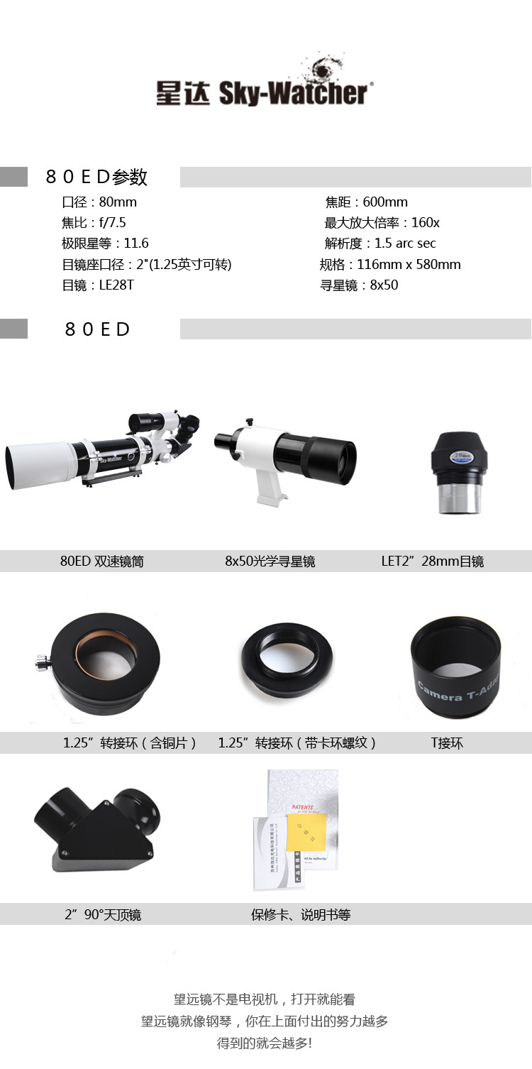 Черный Алмаз 80 ED-это скромный широкополый телескоп, предлагающий яркие, широкиеНебоВ одном виде. Он хорошо подходит для широкополых астрономических наблюдений видных небулей, звездных скоплений и галактик с темного неба, или может быть использован в качестве астрографа для фотосъемки неба. Как наземная Зрительная труба или телеобъектив, производительность Black Diamond 80 ED абсолютно превосходна. Сверхвысокая Контрастность позволяет легко тщательно изучить самые мелкие детали в условиях хорошего зрения. Миниатюрный силуэт Черного Алмаза 80 ED делает превосходный компактный портативный телескоп, который перемещает свет и помещается в небольшом пространстве. Около 50 мощных деталей конструкции становятся очевидными в газовых гигантах нашей Солнечной системы, таких как Сатурн и Юпитер. Луна также демонстрирует поразительные детали кратера вдоль лунного Терминатора.