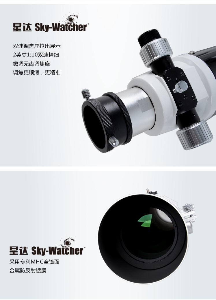 Каждый воздух-стеклянные линзы поверхность имеет экзотические Антибликовое покрытие металлических покрытий, применяется для того чтобы обеспечить оптимальное светильник через положите приближения 99.5%. Фирменные небесно-Watcher «металлические высоко-передающие покрытия» (MHC) являются лучшими фотонными антидисперсионными покрытиями в своем классе.